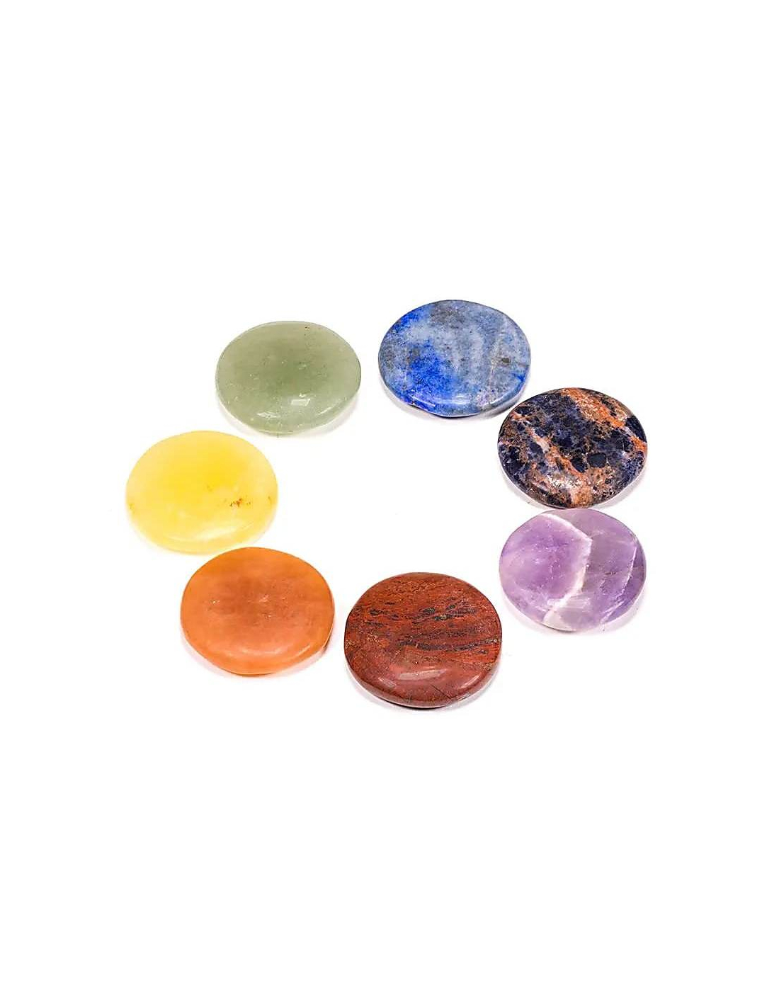 Inhalt: Komplettes Set mit 7 runden Steinen in den Chakra-Farben in einem Samtbeutel.