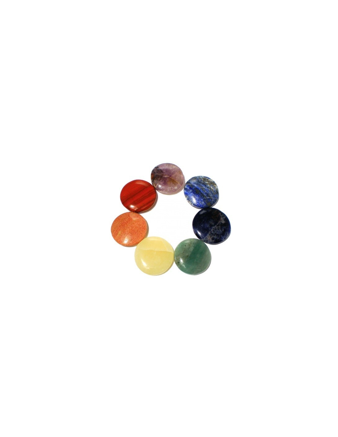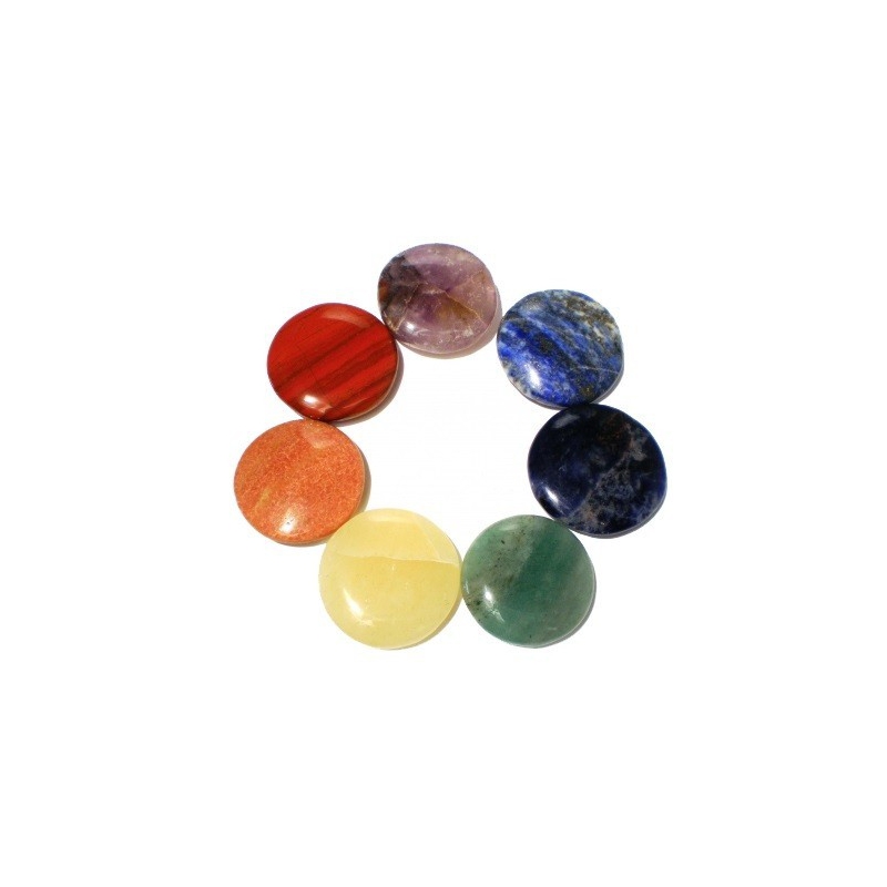 Inhalt: Komplettes Set mit 7 runden Steinen in den Chakra-Farben in einem Samtbeutel.