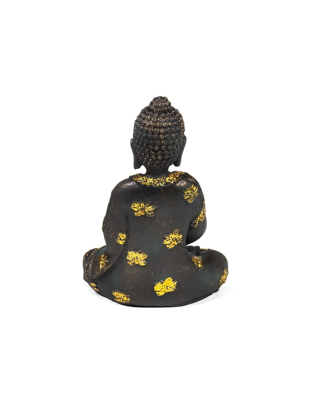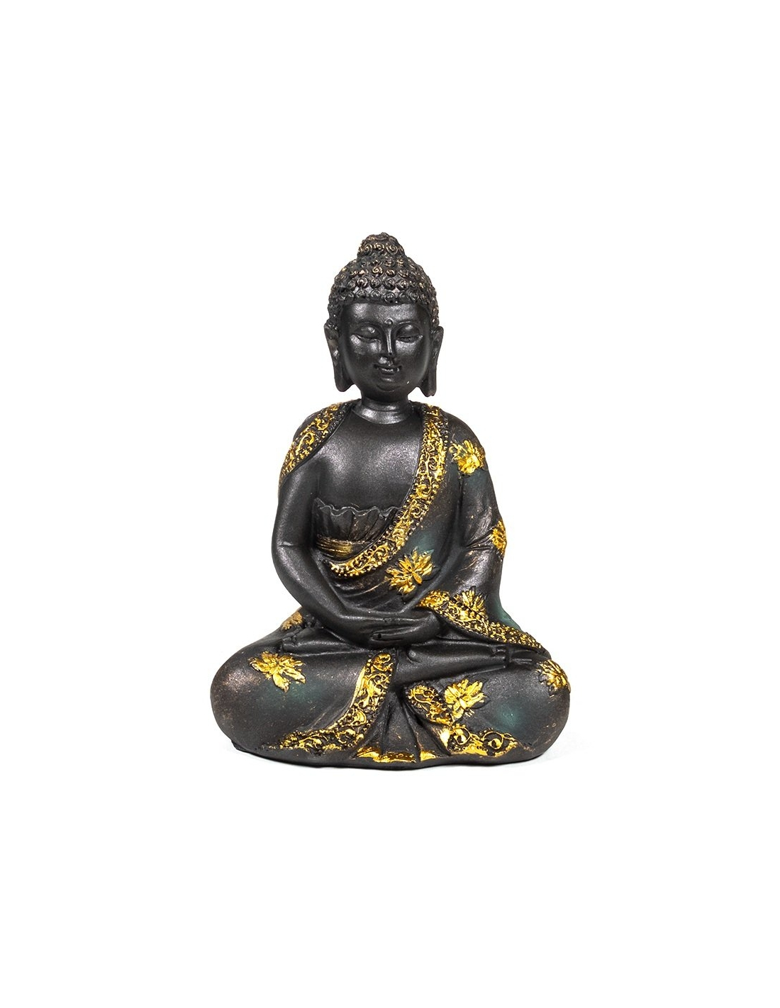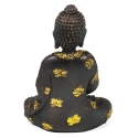 Sitzender Buddha mit dem Mudra des Gleichgewichts in der Meditation. Ein Muster von Lotusblumen auf der Robe.