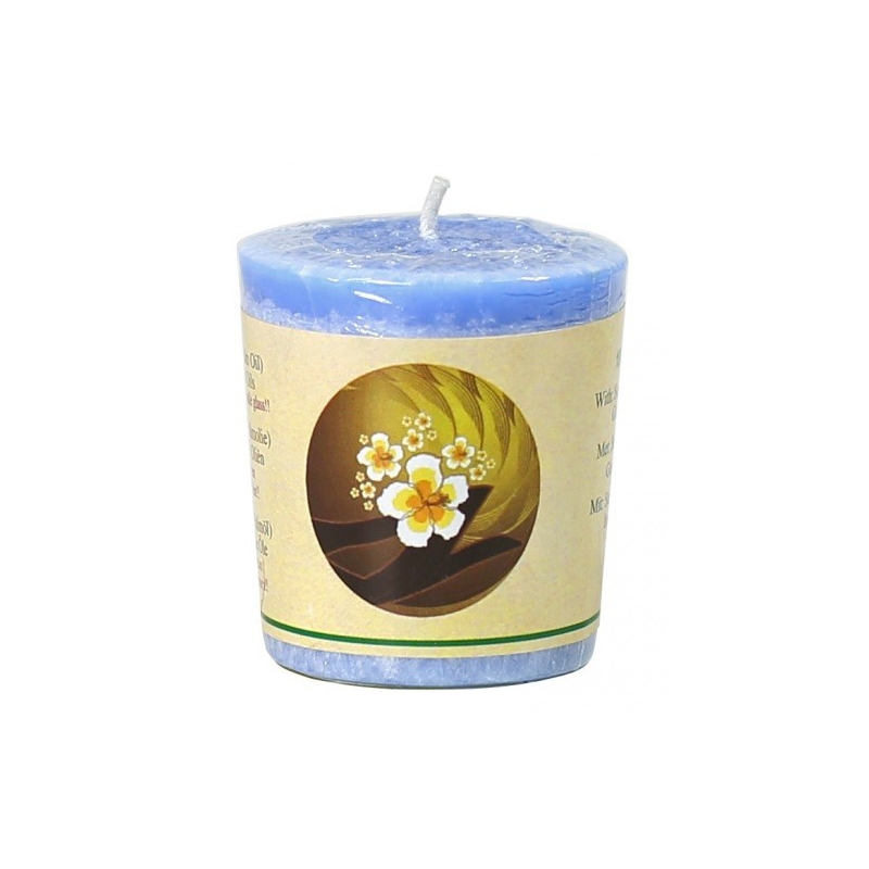 Stearinduftkerze mit ätherischen Ölen: Sandelholz, Myrrhe, Ingwer und Vanille.
