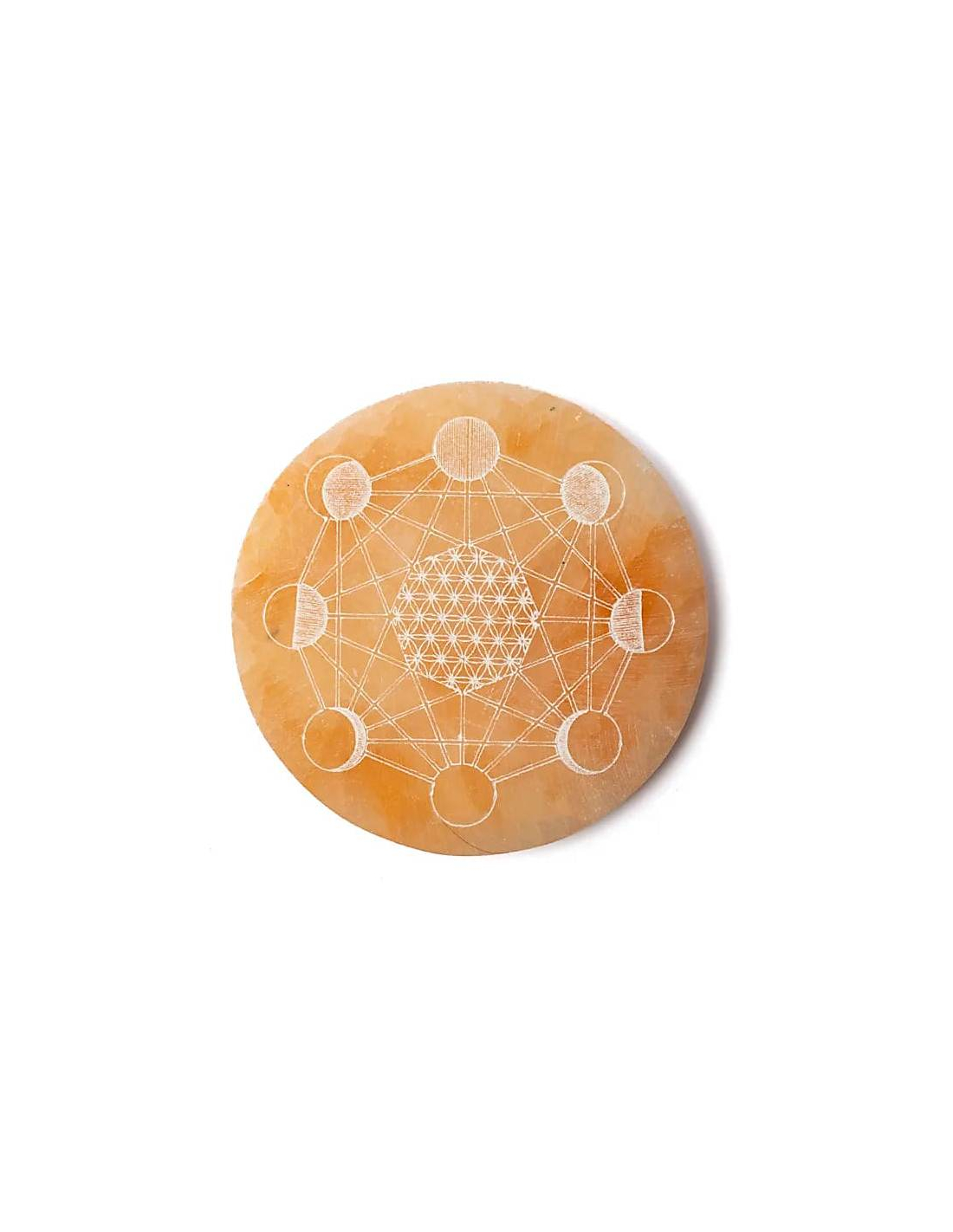 Schaffen Sie Harmonie und Klarheit in Ihrem Raum mit dieser pfirsichfarbenen, gravierten Selenit-Aufladeplatte, ideal zum energetischen Reinigen und Aufladen von Kristallen.