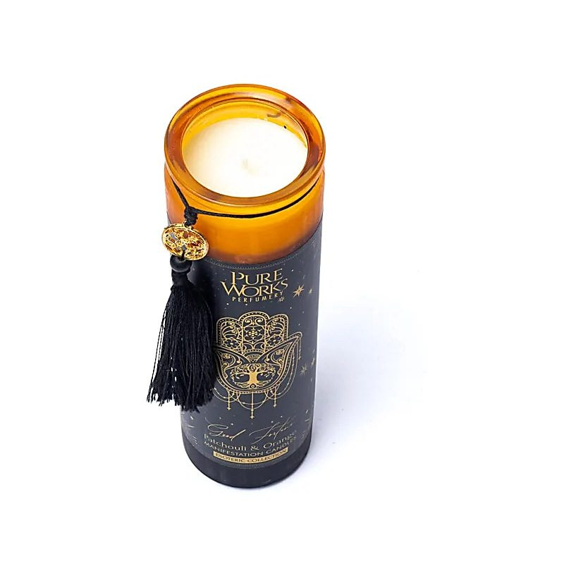 Eine wunderschöne Manifestationskerze in einem eleganten Glasgefäß mit dekorativer Quaste.