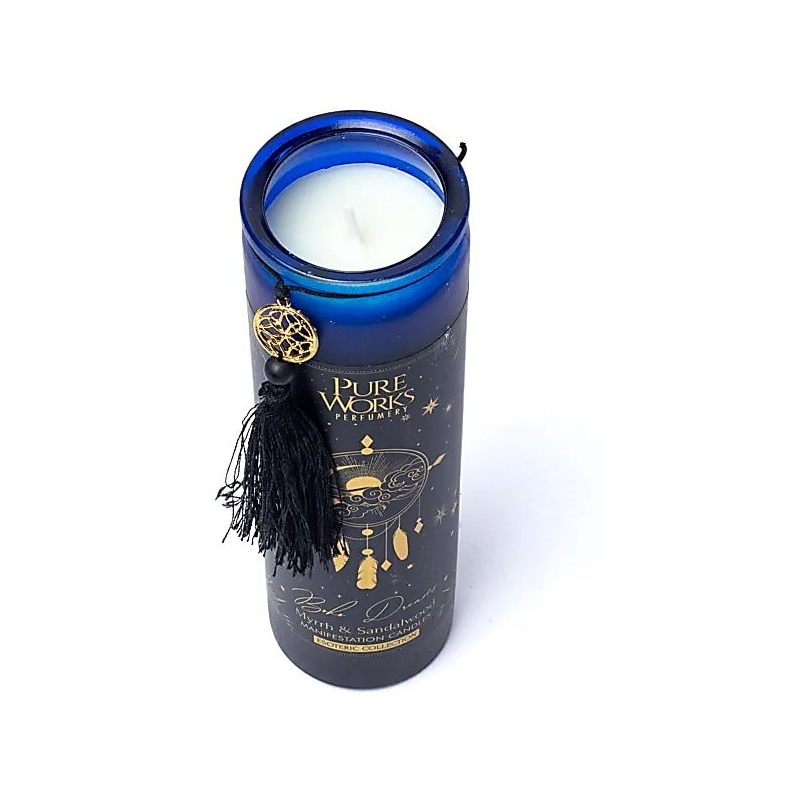 Eine wunderschöne Manifestationskerze in einem eleganten Glasgefäß mit dekorativer Quaste.