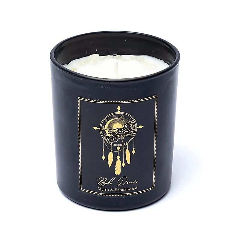 Hergestellt aus Palmwachs, Sojawachs mit ätherischen Ölen, Myrrhe, Sandelholz und Bergkristall