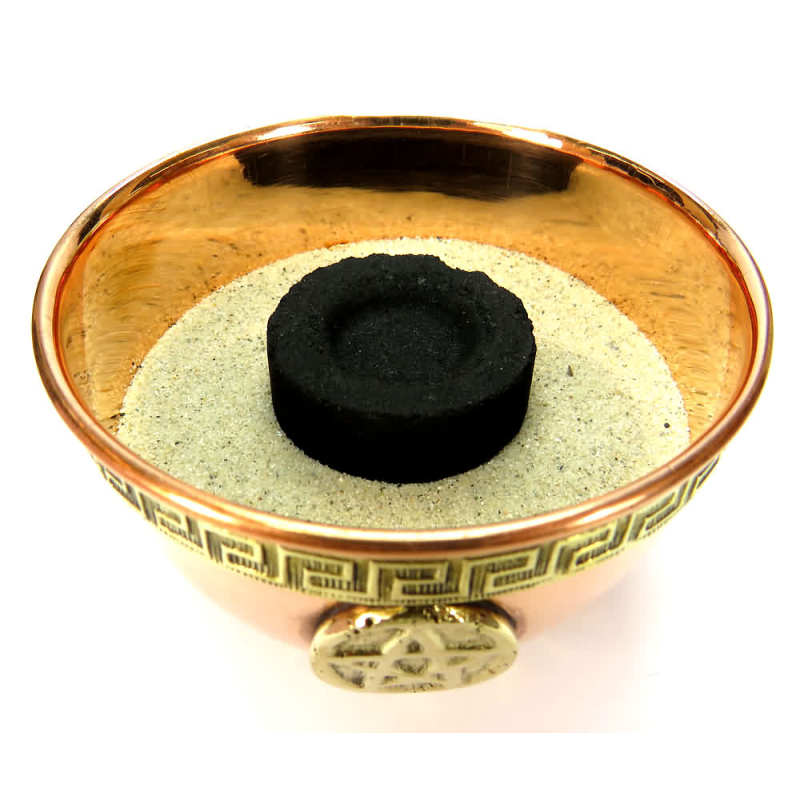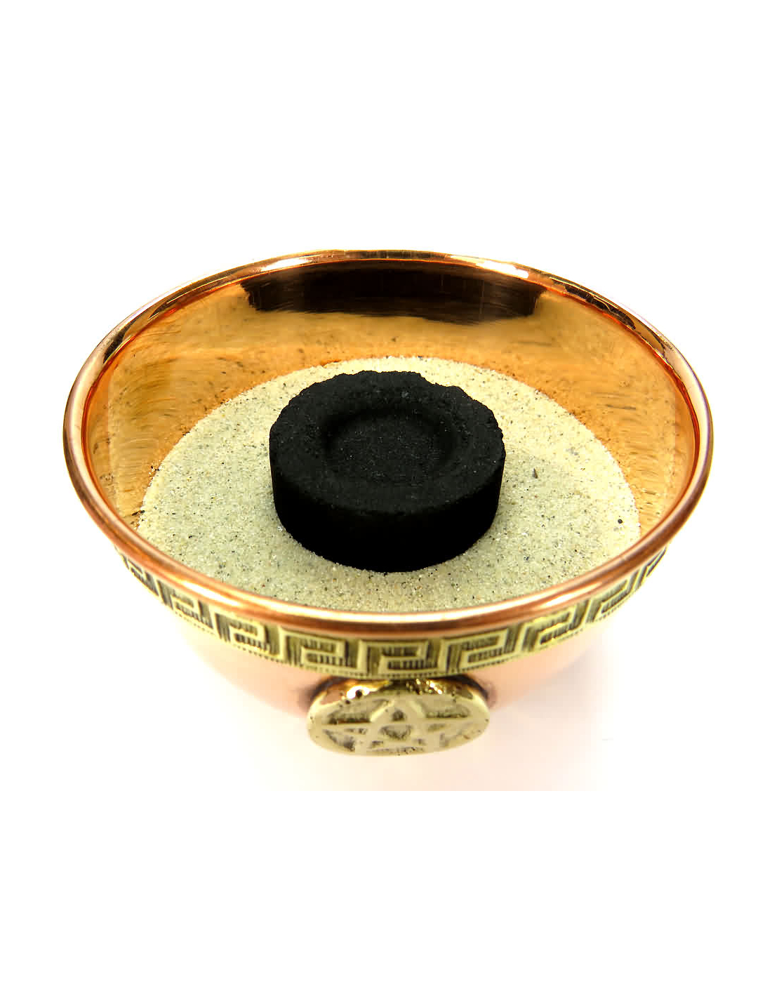 Hinweis: Die Opferschale besteht aus Kupfer und wird heiß. Stellen Sie sie auf eine hitzebeständige Schüssel oder Oberfläche. Sobald die Kohletablette angezündet ist, berühren Sie sie nicht erneut, da dies zu Verbrennungen führen kann. Werfen Sie die Asche nicht in den Müll, da dies zu einem Brand führen könnte. Bewahren Sie das Räuchergefäß außerhalb der Reichweite von Kindern und Haustieren auf und lassen Sie es nicht unbeaufsichtigt.