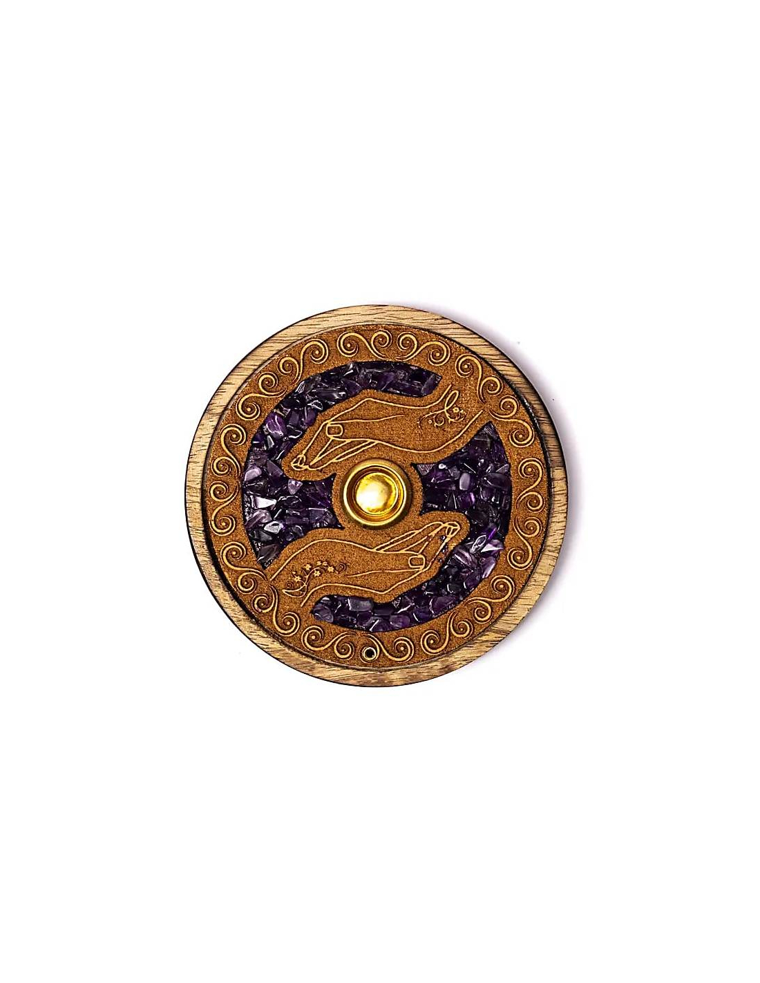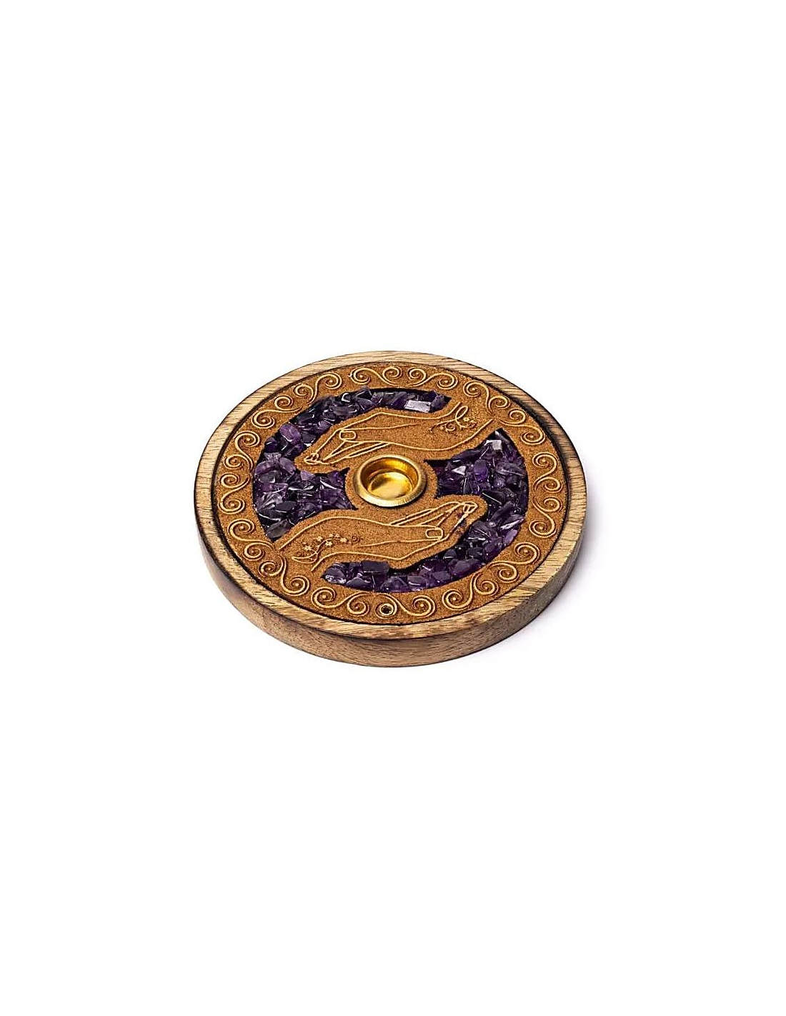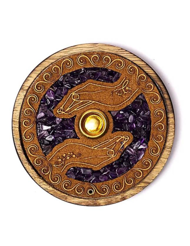 Dieser wunderschöne Räucherstäbchenhalter eignet sich zum Abbrennen von Räucherstäbchen und Räucherkegeln. In der Mitte des Halters sind zwei mit Amethyststeinen eingravierte Hände angebracht. Der Amethyst ist ein sehr kraftvoller und schützender Stein mit einer sehr spirituellen Schwingung.