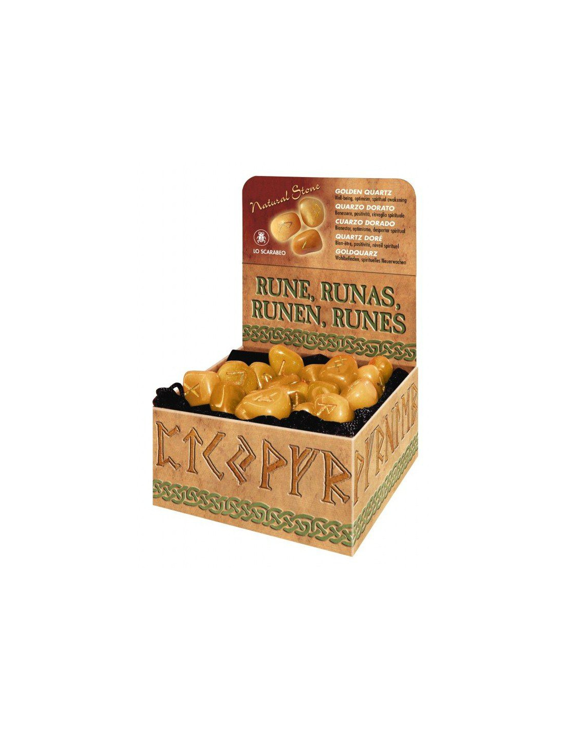 Runensteine aus Goldquarz im Beutel aus Velours mit eingravierten Runensymbolen (25 Stück) und einem Anleitungsheft. Ein verfeinerter Artikel, den Sie anderen oder sich selbst geben können.