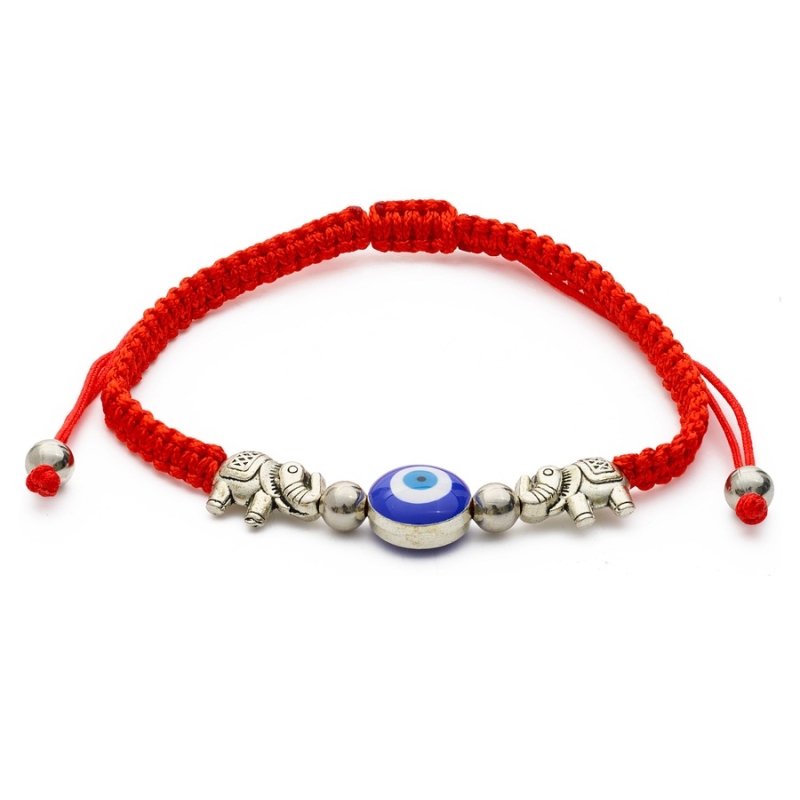 Farbe: rot Seilarmband mit blauem Auge und silbernen Elefanten