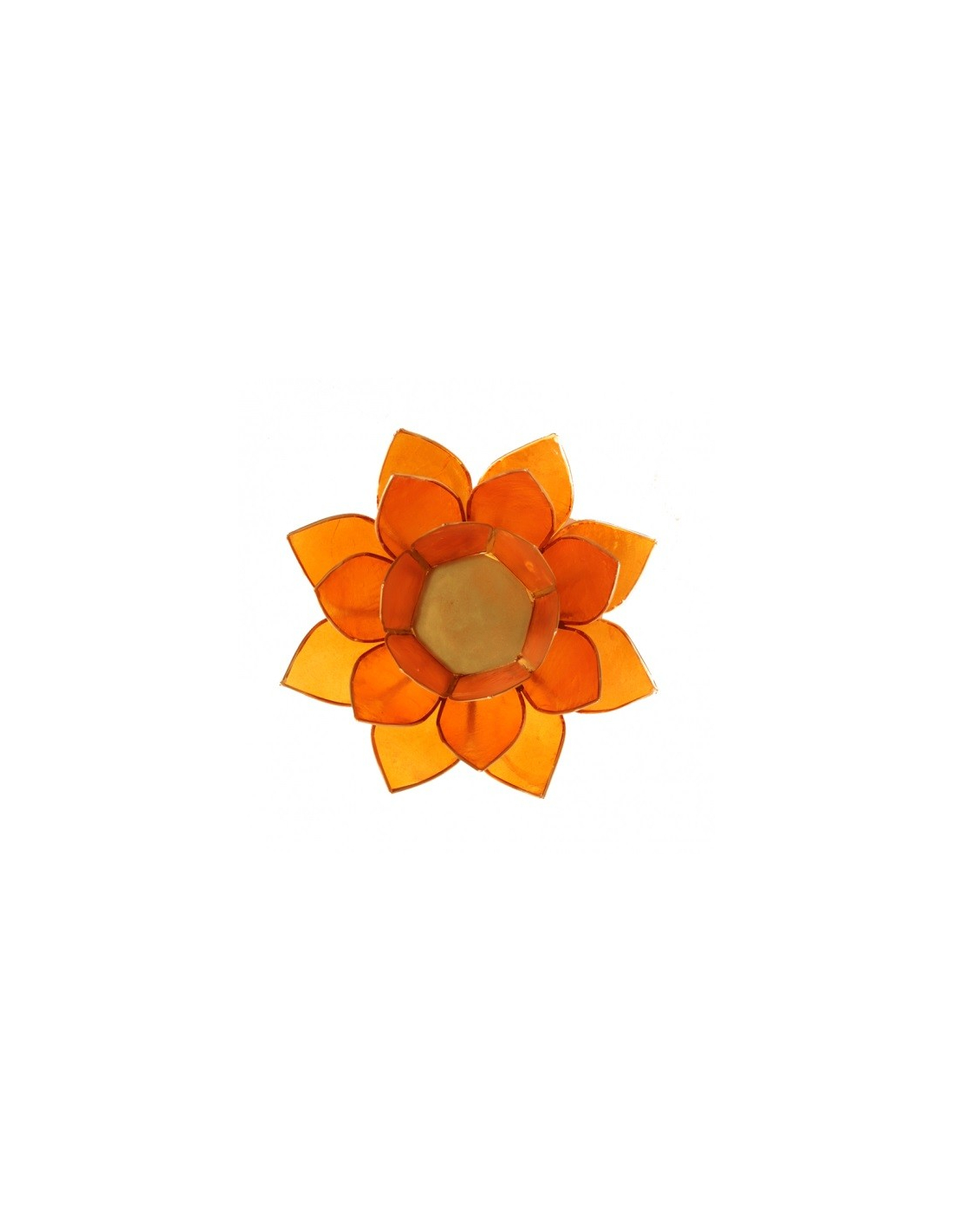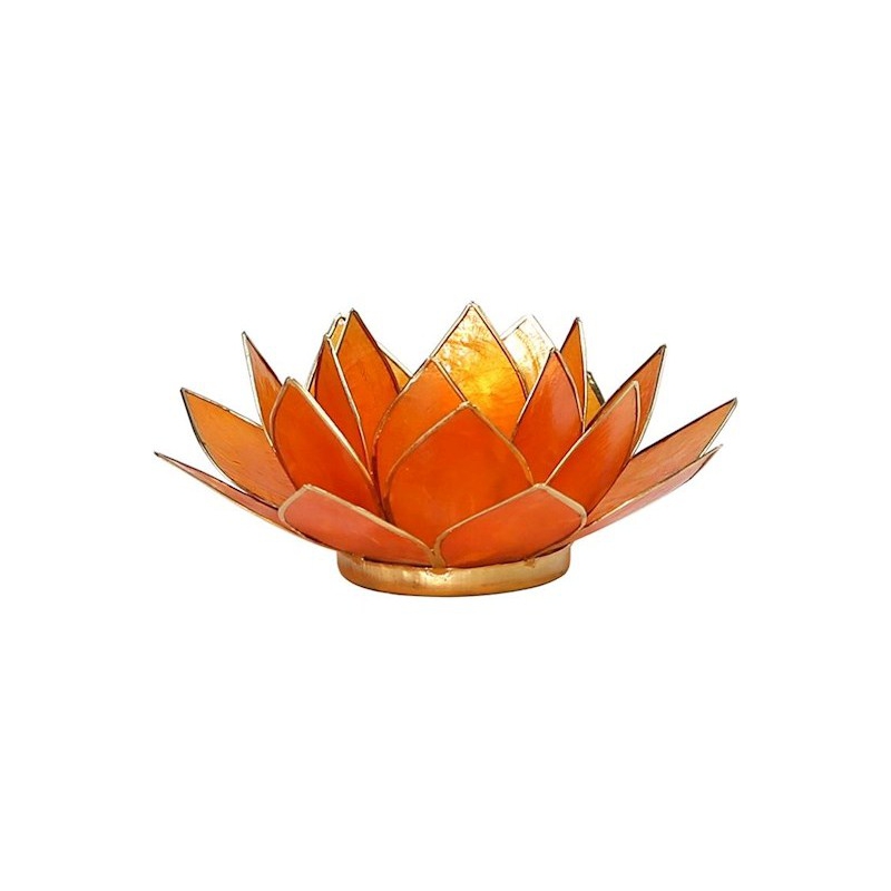 Wunderschönes großes Lotus-Stimmungslicht aus Capiz-Muschel in der Farbe Amber-Orange. Der Lotus ist das Symbol der Dunkelheit für das Licht, von der Unwissenheit bis zur Erkenntnis. Der Lotus symbolisiert auch die 7 Energiezentren im menschlichen Körper, die Chakren.