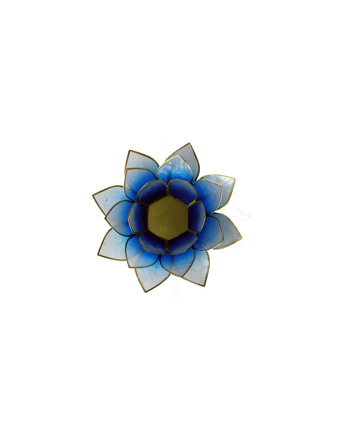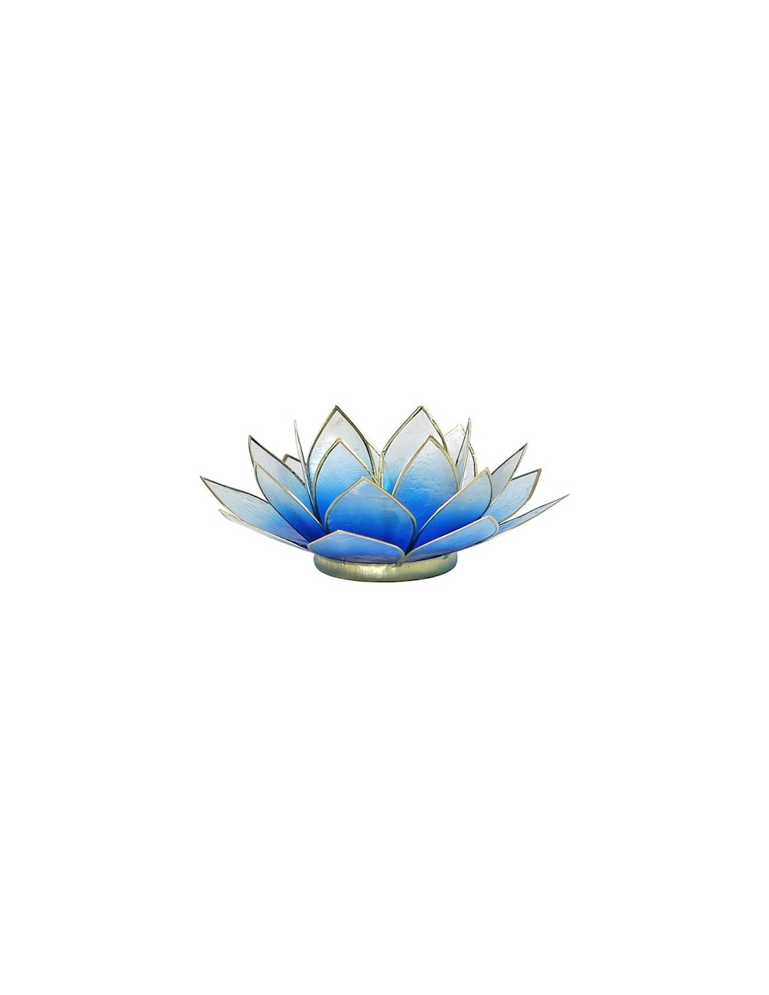 Wunderschönes großes Lotus-Stimmungslicht aus Capiz-Muschel in der Farbe hellblau. Der Lotus ist das Symbol der Dunkelheit für das Licht, von der Unwissenheit bis zur Erkenntnis. Der Lotus symbolisiert auch die 7 Energiezentren im menschlichen Körper, die Chakren.