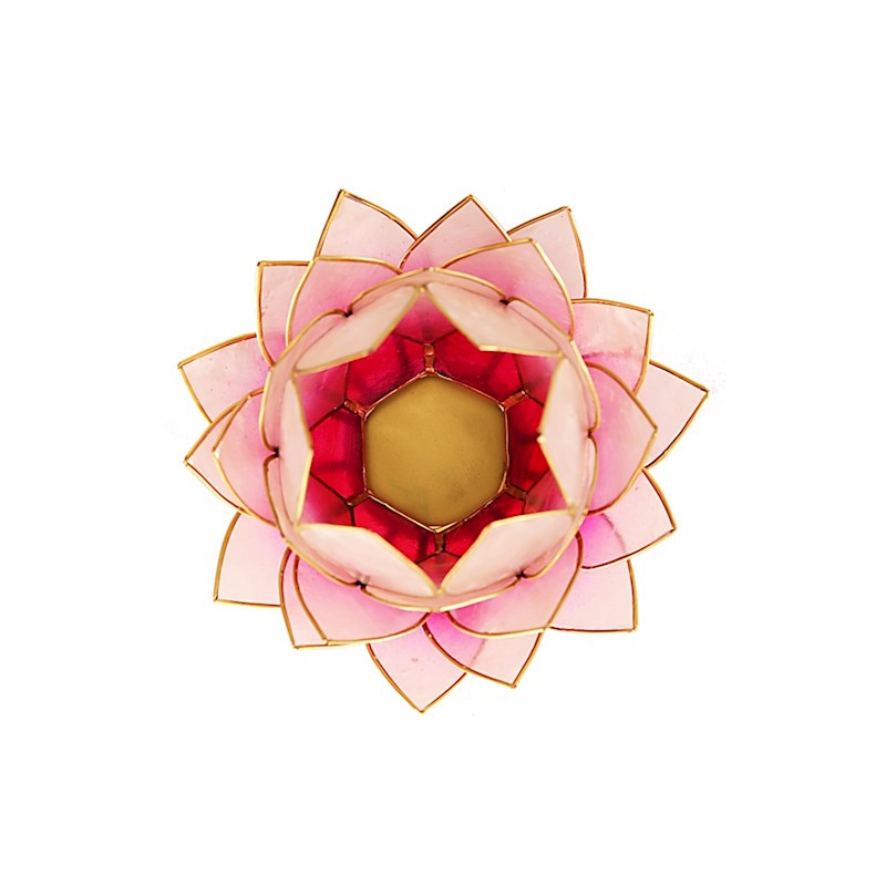 Wunderschönes großes Lotus-Stimmungslicht aus Capiz-Muschel in der Farbe Pink. Der Lotus ist das Symbol der Dunkelheit für das Licht, von der Unwissenheit bis zur Erkenntnis. Der Lotus symbolisiert auch die 7 Energiezentren im menschlichen Körper, die Chakren.