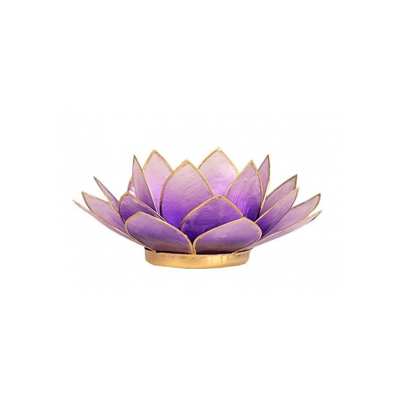 Wunderschönes großes Lotus-Stimmungslicht aus Capiz-Muschel in der Farbe Violett. Der Lotus ist das Symbol der Dunkelheit für das Licht, von der Unwissenheit bis zur Erkenntnis. Der Lotus symbolisiert auch die 7 Energiezentren im menschlichen Körper, die Chakren.