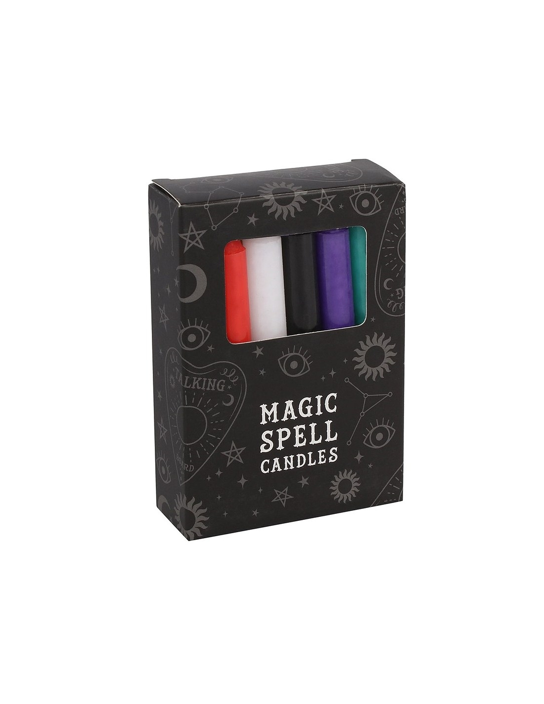 A mix of 12 spell candles in various colors. Candle magic is one of the simplest forms of spells where the player sets a goal and visualizes the end result. Write your intention on a sheet of paper in the same color as the candle and burn the paper in a fireproof bowl. The candle must be completely burned to complete the spell.