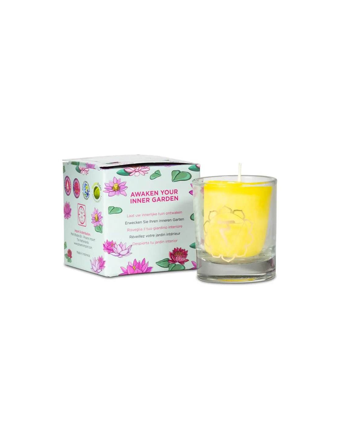 Packaging: Cardboard gift box printed with lotus flowers with information in English, Dutch, German, Italian, French and Spanish.