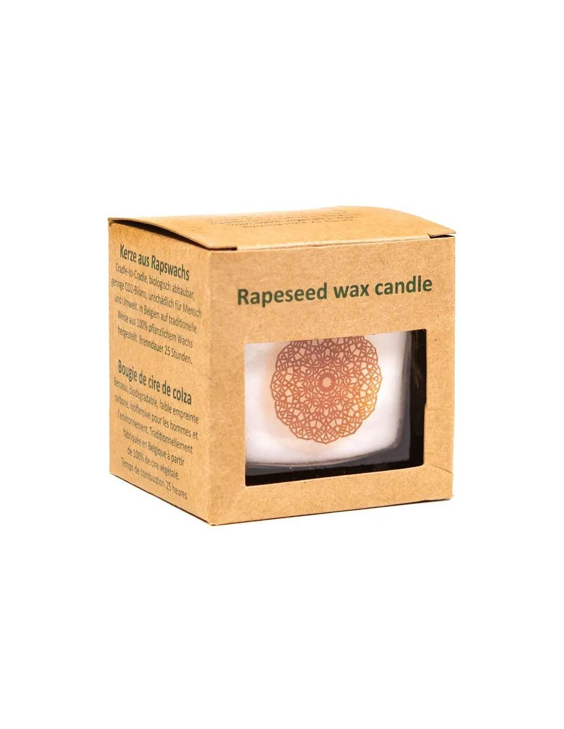 Scented candle of 100% vegetable ecological rapeseed wax in recycled glass. The candle is made in the traditional way in Belgium, with paraben-free fragrance oils. Biodegradable and therefore harmless to people and the environment.