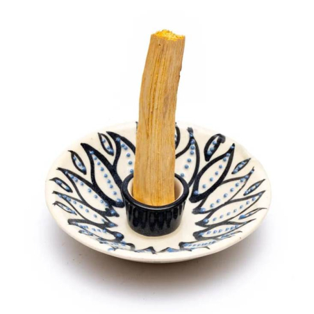 A beautifully white decorated incense holder, specially designed for the safe burning of Palo Santo wood sticks.
