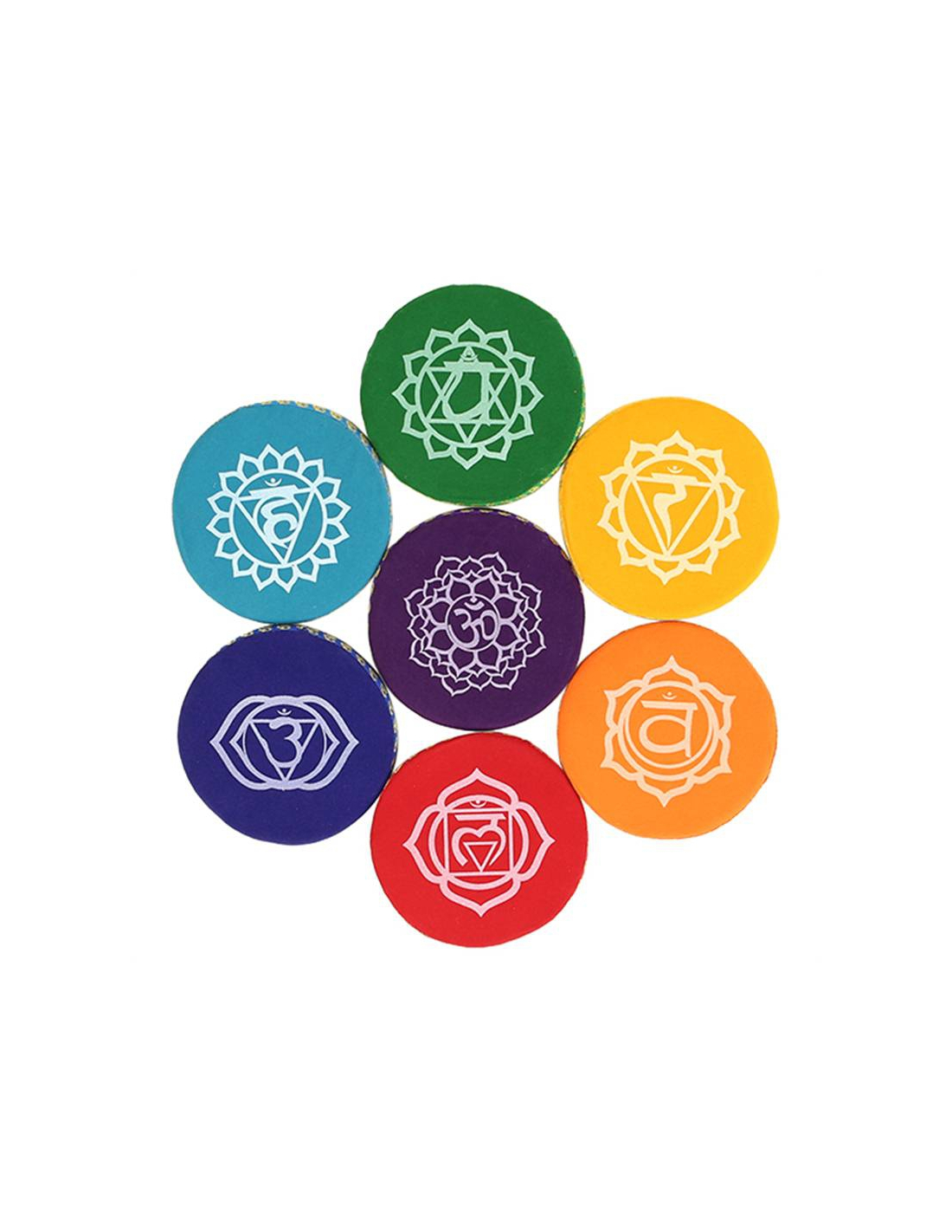 Pack of 7 singing bowl cushions in the colors of the chakras with chakra images.