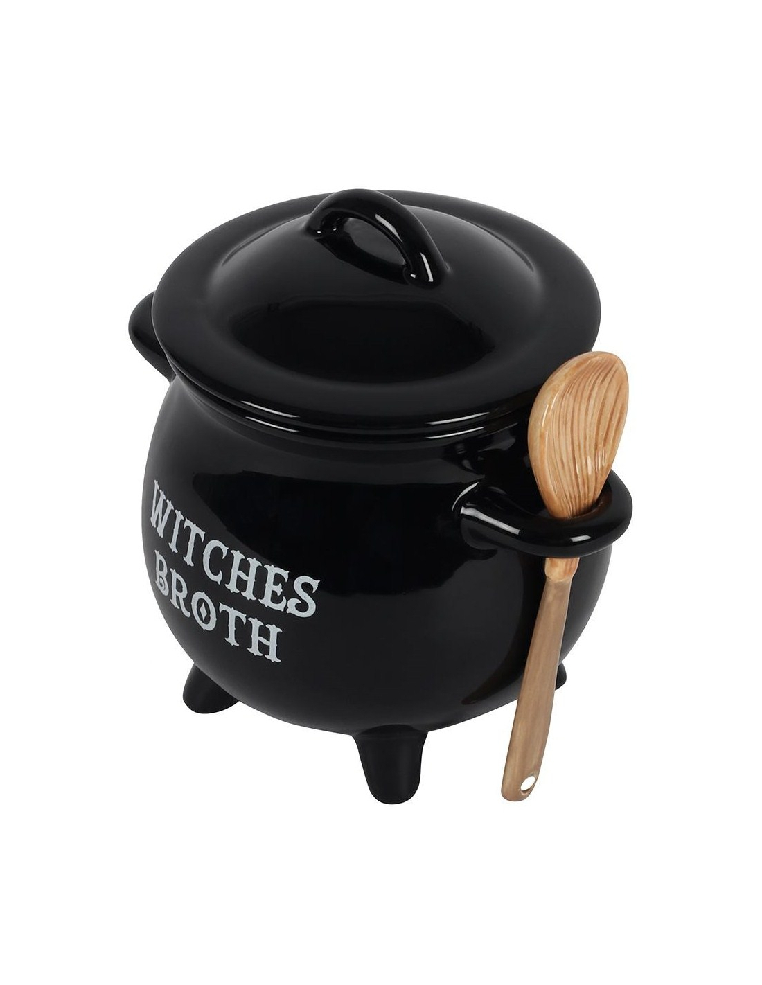 The soup bowl has a lid with handle and a wooden spoon in the shape of a broomstick. Always useful! Give it as a present or use it as a Halloween decoration!