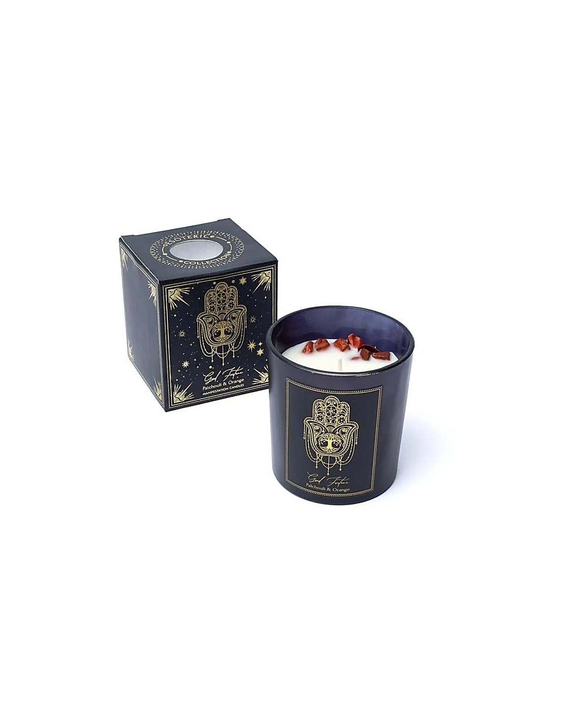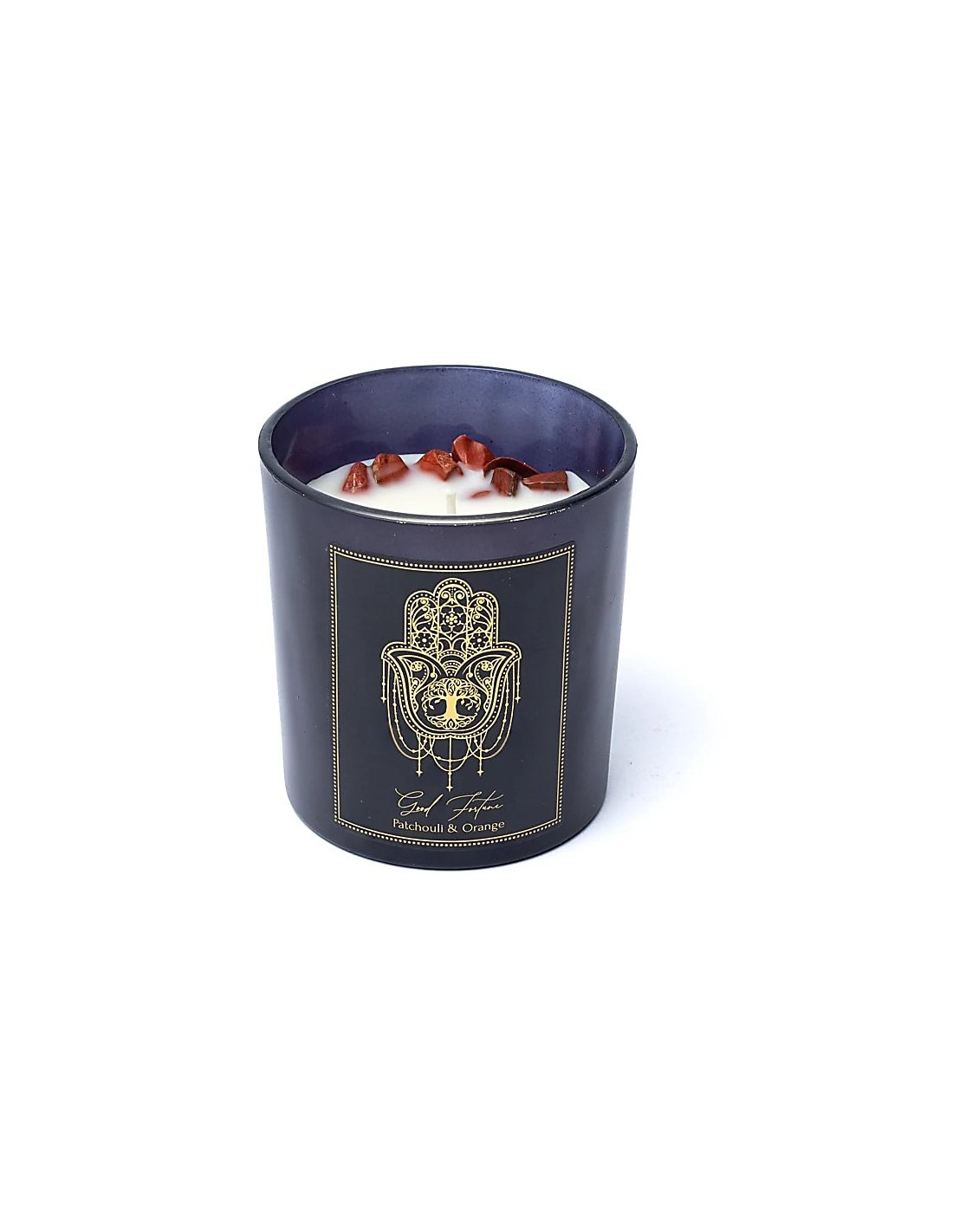 Made from palm wax, soy wax with essential oils, patchouli, orange and red jasper gemstones