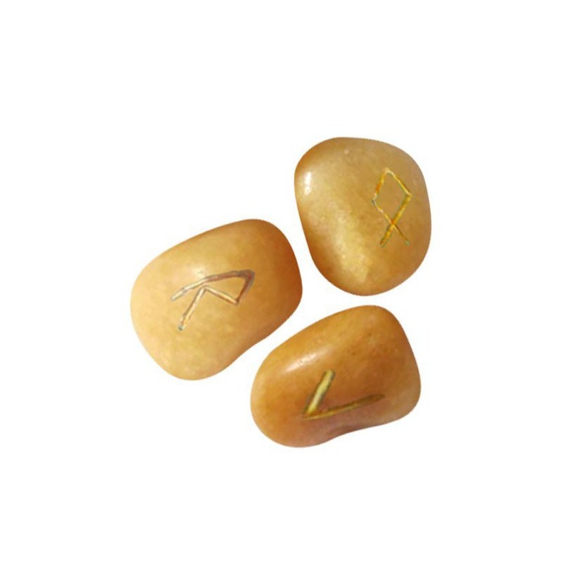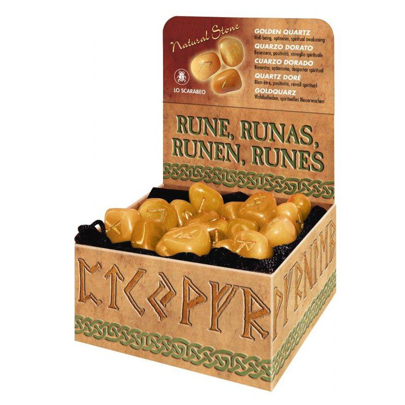 Rune stones of gold quartz in pouch of velours with engraved runic symbols (25 pieces) and an instruction booklet. A refined article to give to others or to themselves.