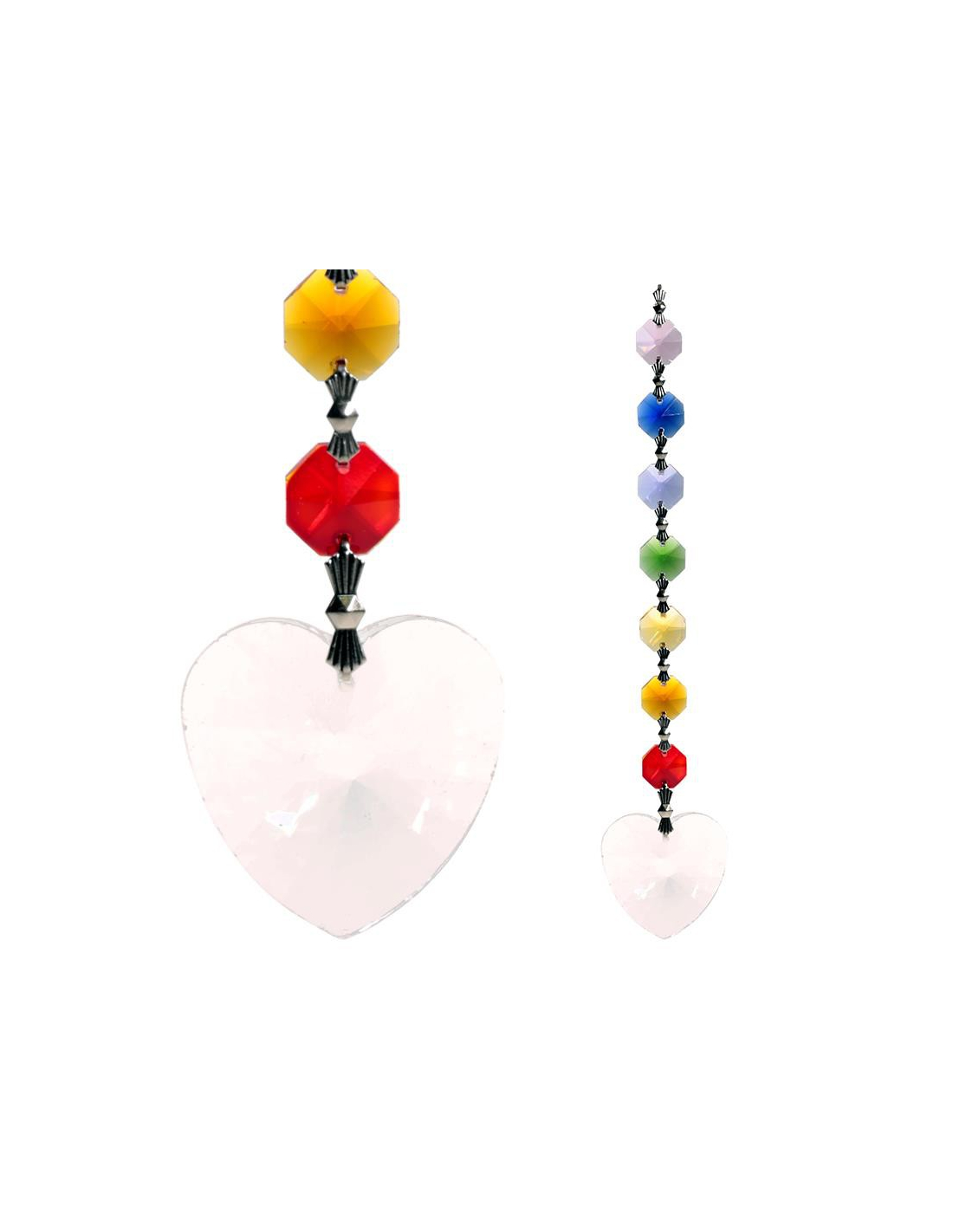 The heart-shaped crystal symbolizes "Metta - Unconditional Love". Crystal window decorations are ideally suited to improve feng-shui in the living room, bedroom and office. The seven small octagon crystals symbolize the 7 chakra colors. When you hang it by the window, the sunlight conjures magical colors throughout the room!