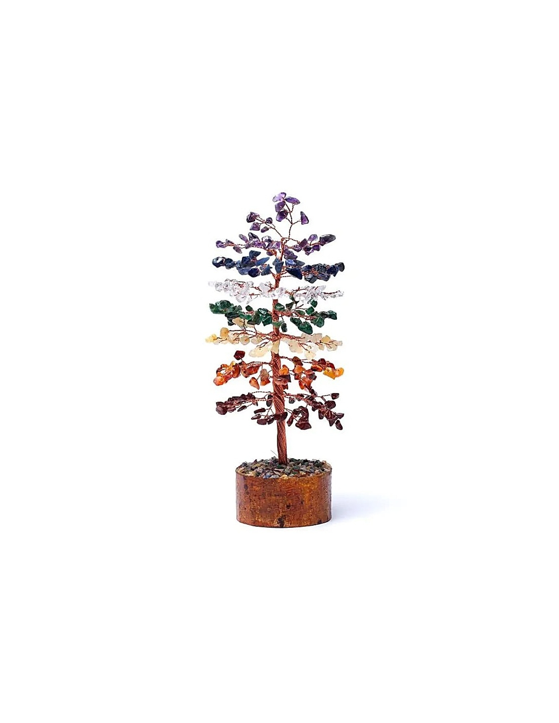 Un bel arbre à pierres précieuses avec des feuilles de diverses pierres précieuses (jaspe rouge, cornaline, quartz doré, aventurine verte, cristal de roche, sodalite et améthyste), qui représentent les 7 chakras. Ces œuvres d’art sont conçues pour rayonner de grâce et de beauté et sont souvent utilisées dans le feng shui car elles confèrent une énergie positive et une protection.
