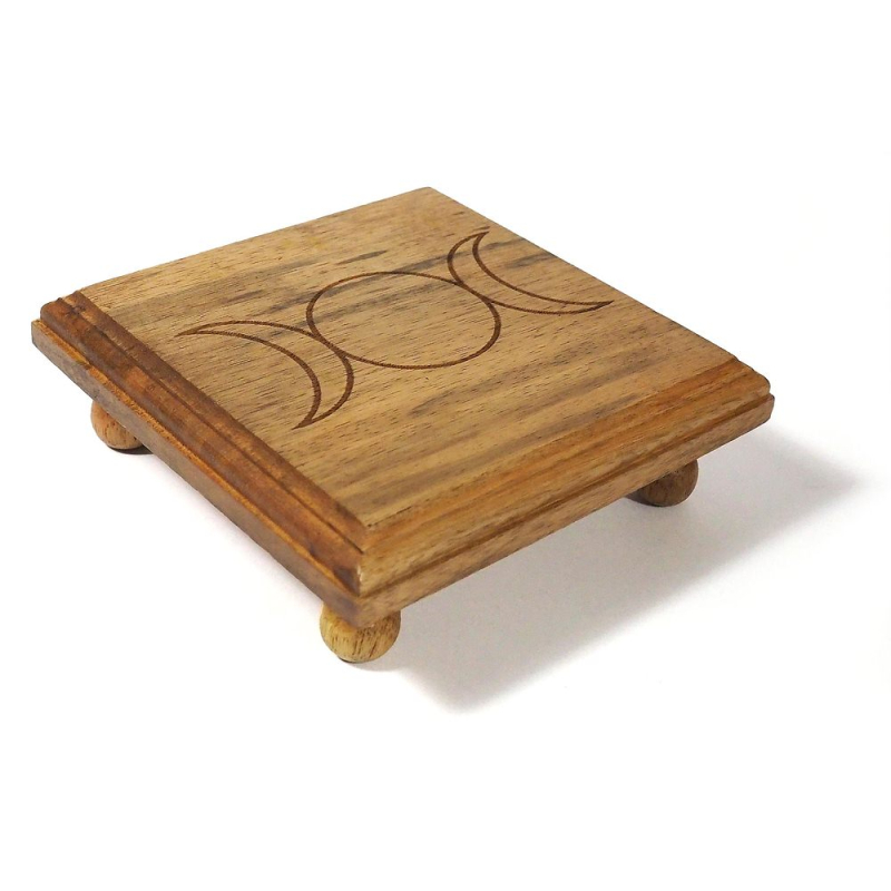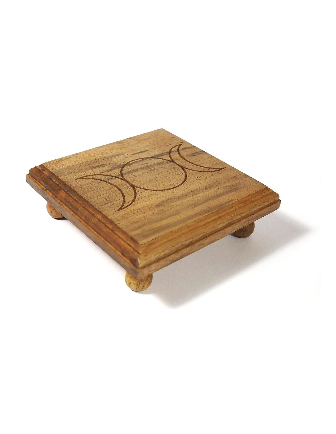 Une table d'autel magnifiquement faite à la main avec un symbole de triple lune gravé dans le bois de manguier. Utilisez cette mini table d'autel pour les rituels, les cérémonies ou comme table pour vos cristaux.