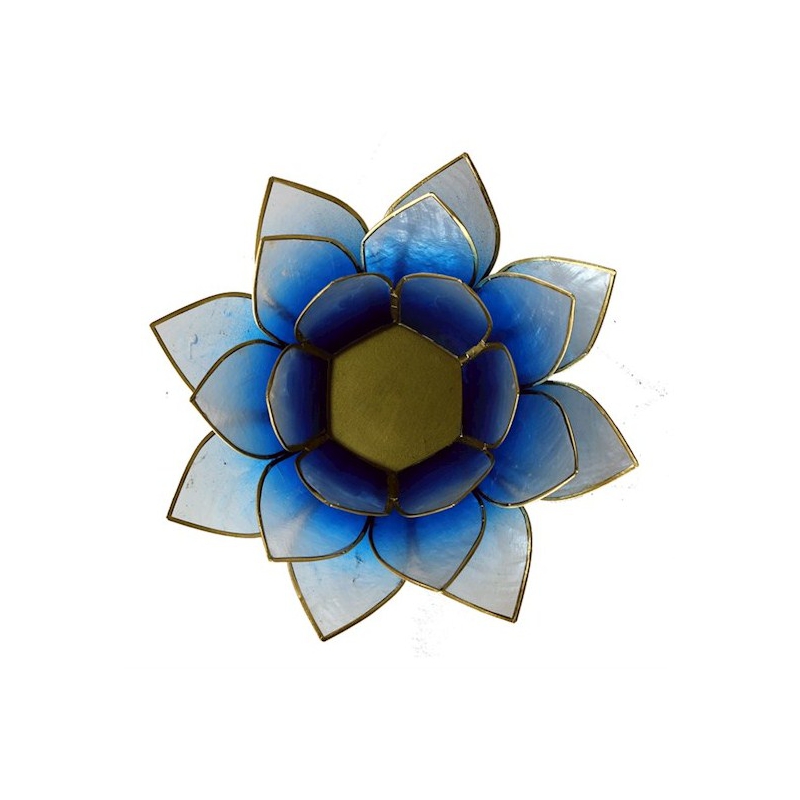 Belle et grande lumière d'ambiance Lotus en capiz de couleur bleu clair. Le Lotus est le symbole des ténèbres à la lumière, de l'ignorance à la connaissance. Le lotus symbolise également les 7 centres d'énergie du corps humain, les chakras.