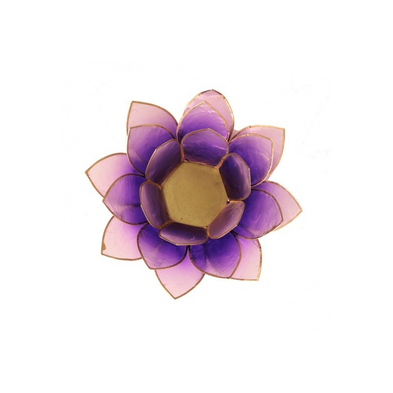 Belle et grande lumière d'ambiance Lotus en coquille Capiz de couleur violette. Le Lotus est le symbole des ténèbres à la lumière, de l'ignorance à la connaissance. Le lotus symbolise également les 7 centres d'énergie du corps humain, les chakras.