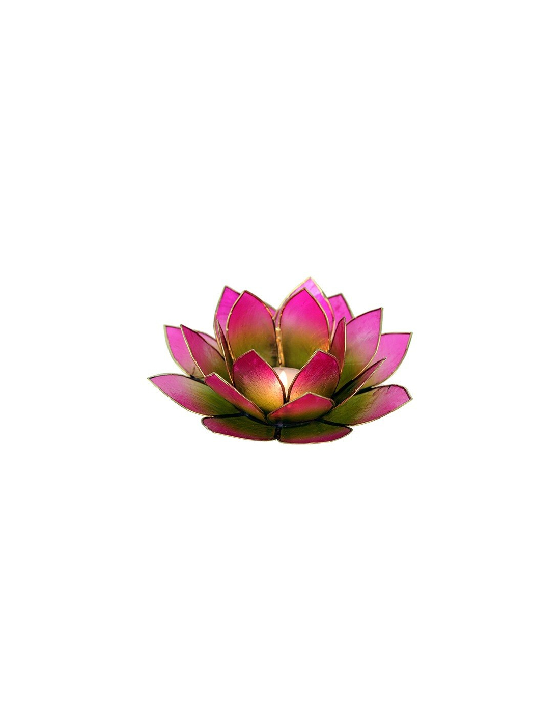 Belle et grande lumière d'ambiance Lotus faite de coquille Capiz dans les couleurs rose et vert. Le Lotus est le symbole des ténèbres à la lumière, de l'ignorance à la connaissance. Le lotus symbolise également les 7 centres d'énergie du corps humain, les chakras.