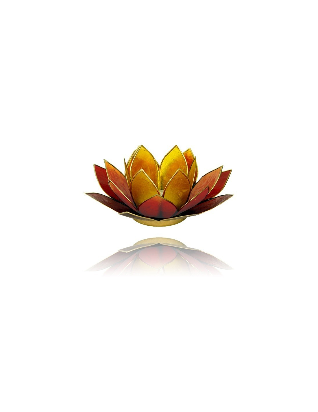 Belle et grande lumière d'ambiance Lotus faite de coquille Capiz dans les couleurs jaune, orange et rouge. Le Lotus est le symbole des ténèbres à la lumière, de l'ignorance à la connaissance. Le lotus symbolise également les 7 centres d'énergie du corps humain, les chakras.