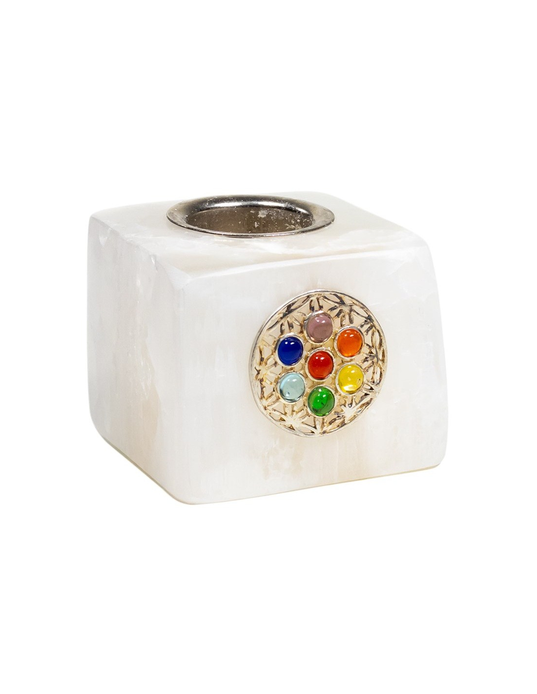 Un bougeoir en pierres précieuses pour bougies de dîner en sélénite avec la fleur de la vie. Ce bougeoir convient aux bougies de dîner d'un diamètre de 2 cm.