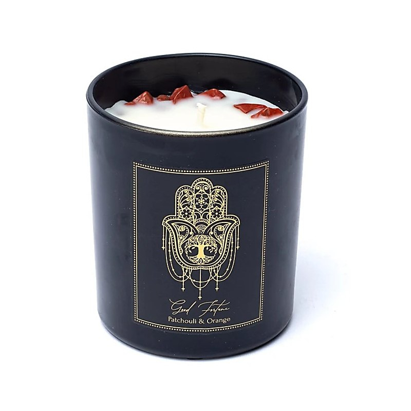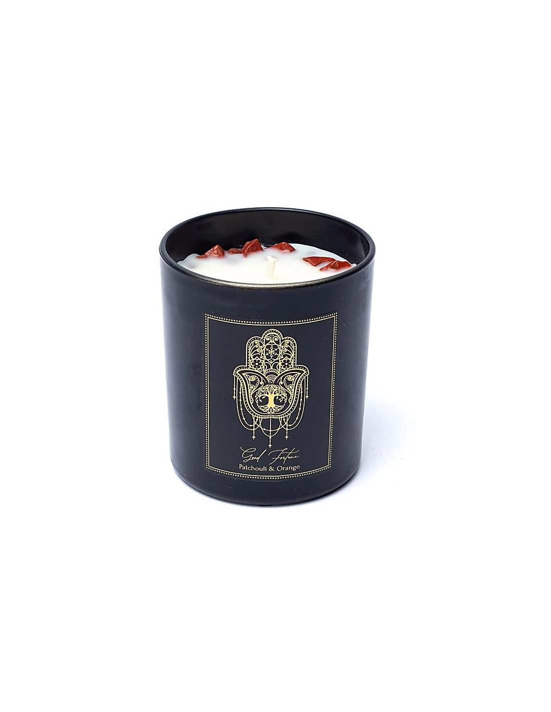 À base de cire de palme, de cire de soja aux huiles essentielles, de patchouli, d'orange et de jaspe rouge