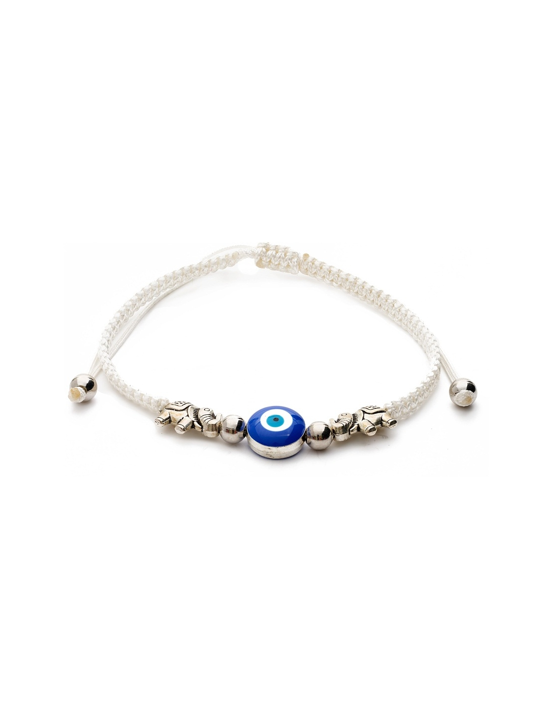 Couleur: bracelet corde blanc avec oeil bleu et éléphants argentés