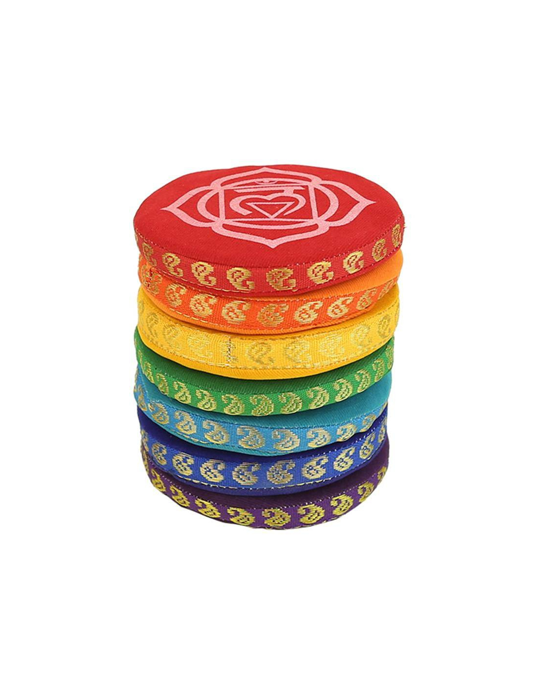 Pack de 7 coussins bol chantants aux couleurs des chakras avec des images de chakra.