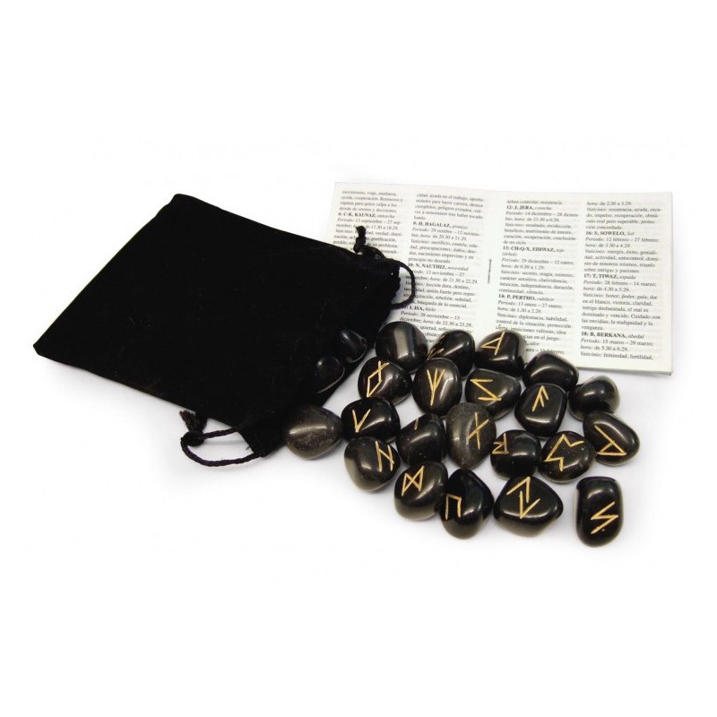 Pierres runiques d'onyx noir dans une pochette de velours avec symboles runiques gravés (25 pièces) et un livret d'instructions. Un article raffiné à donner aux autres ou à eux-mêmes.
