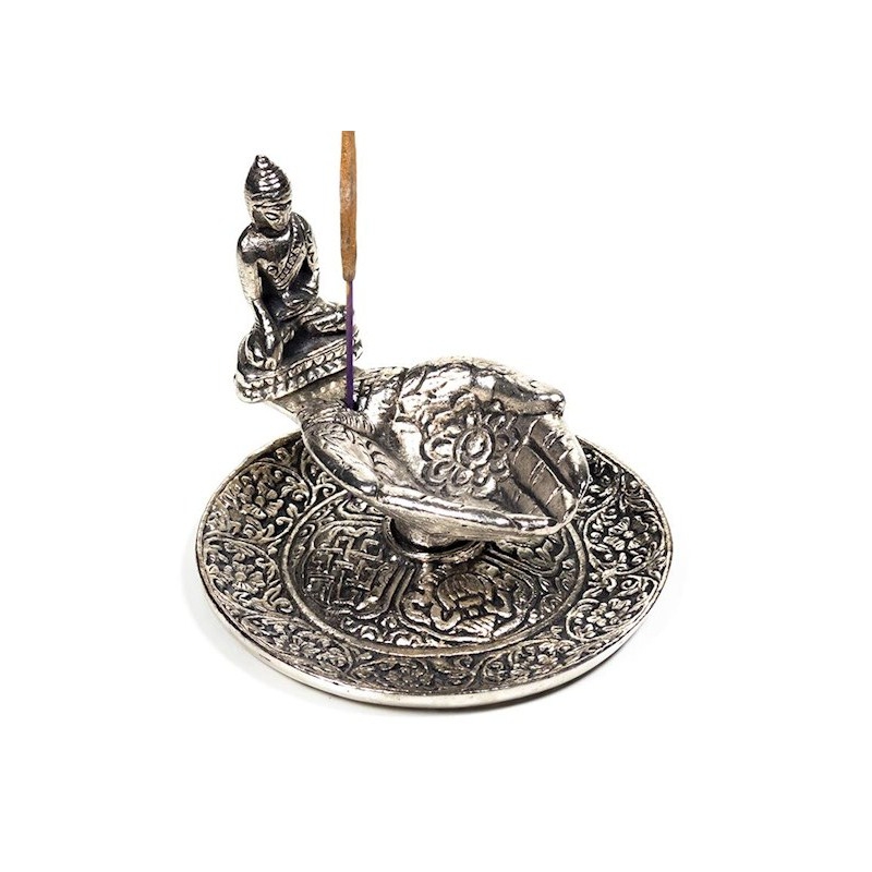 • Brûleur d'encens de couleur argent offrant des mains avec Bouddha