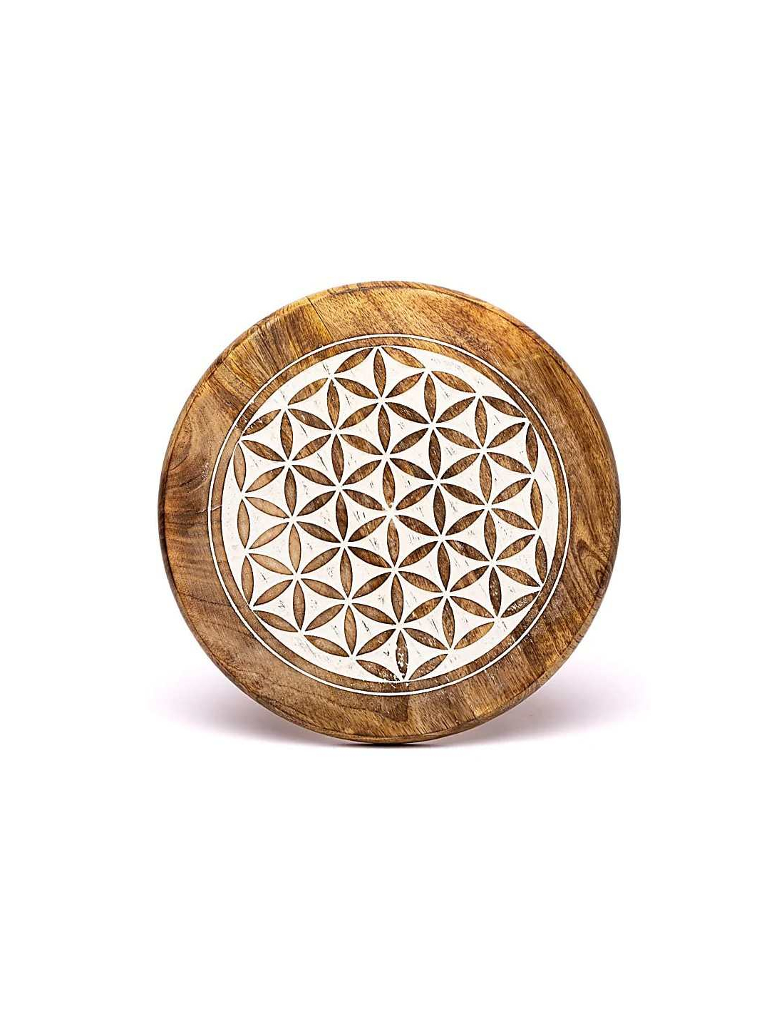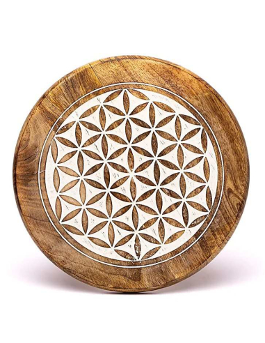 Cette charmante table d'appoint en manguier massif est une véritable source d'inspiration. Son plateau est magnifiquement décoré d'une Fleur de Vie détaillée, symbole puissant d'harmonie, de croissance et de protection.