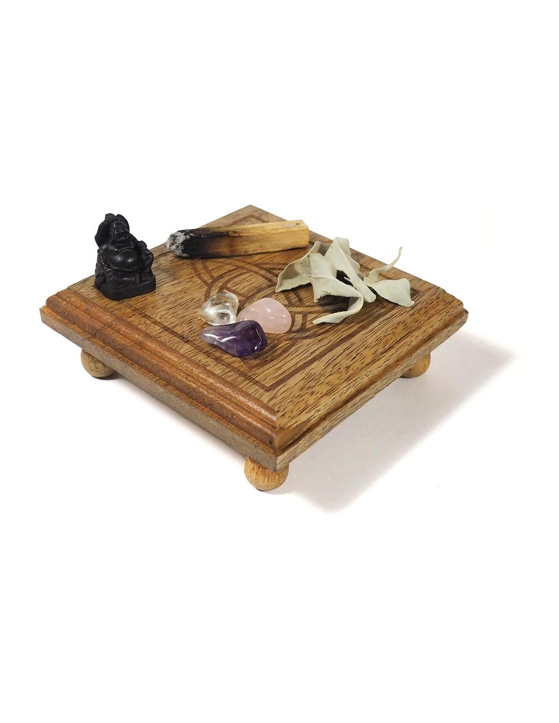 Een prachtig handgemaakte altaar tafel met een in het mangohout gegraveerd triquetra symbool.