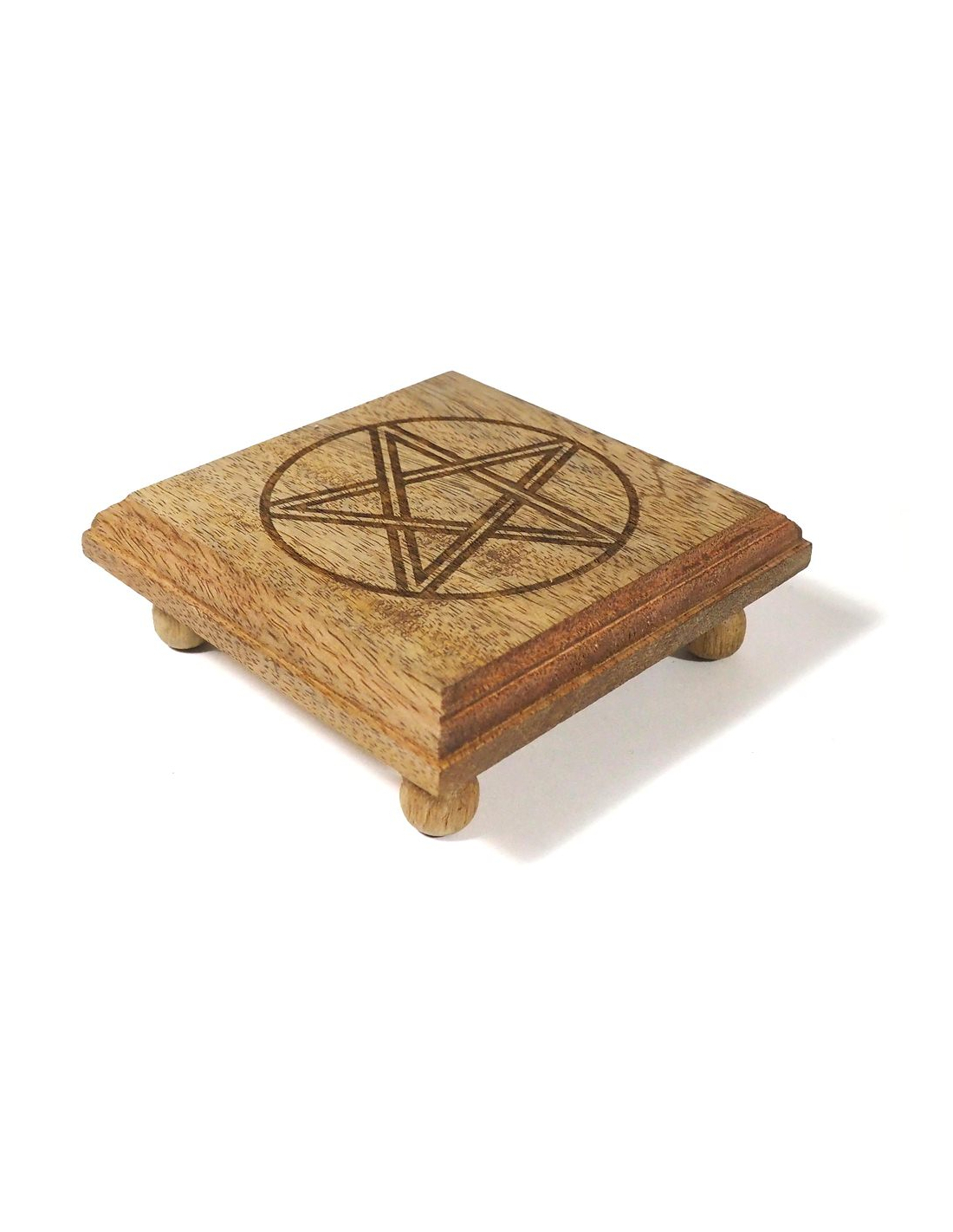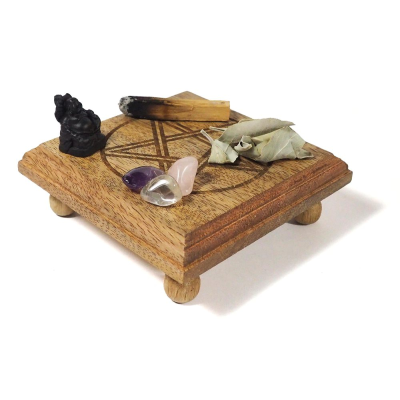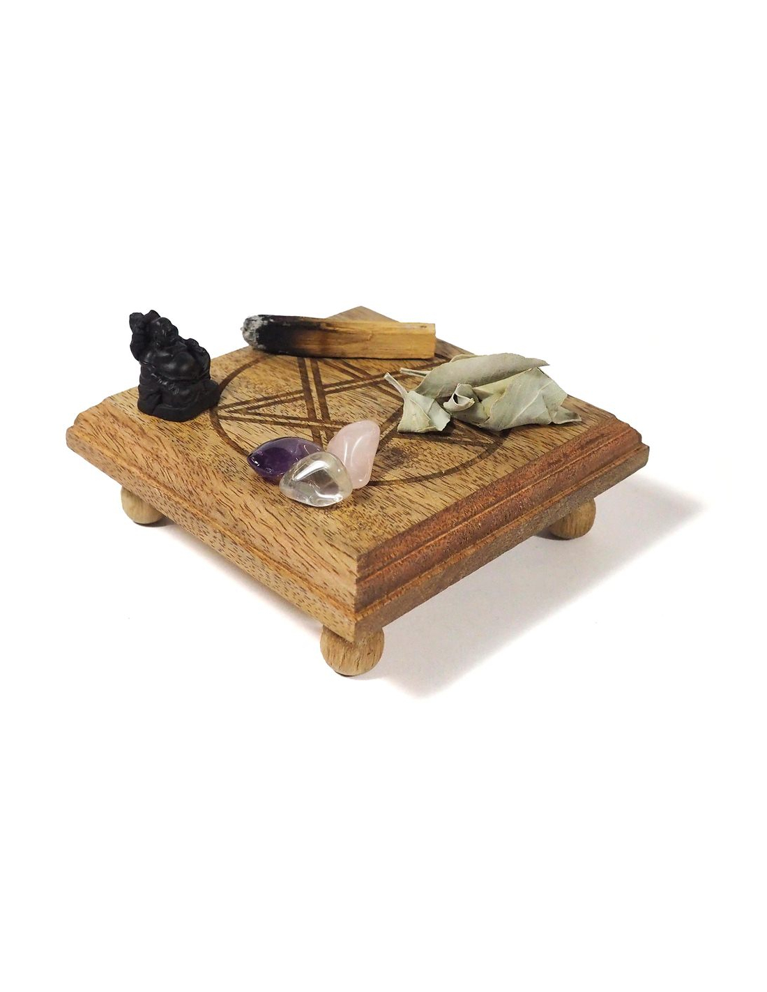 Een prachtig handgemaakte altaar tafel met een in het mangohout gegraveerd pentagram symbool.