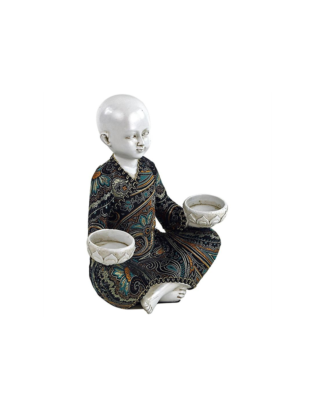 In zijn handen houdt hij 2 lotussen vast waarin een waxinelichtje geplaatst kan worden. De lotus staat symbool voor de transformatie van duisternis naar het licht, van onwetendheid naar weten.