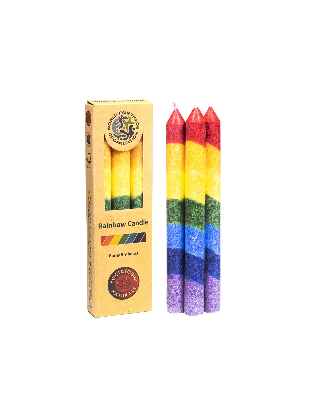 3 geurloze kaarsen in de regenboogkleuren. Speciaal om een atmosfeer van vrede en harmonie te creëren.