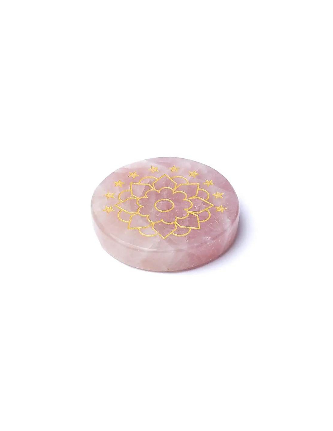 Breng zachtheid, liefde en innerlijke rust in je leven met deze prachtige gegraveerde rozenkwarts schijf, versierd met het lotus symbool, een krachtig teken van zuiverheid en spirituele verlichting. Plaats deze bijzondere schijf op je altaar, gebruik haar tijdens meditatie, of draag haar bij je als talisman om de energie van liefde en spirituele groei de hele dag met je mee te dragen.