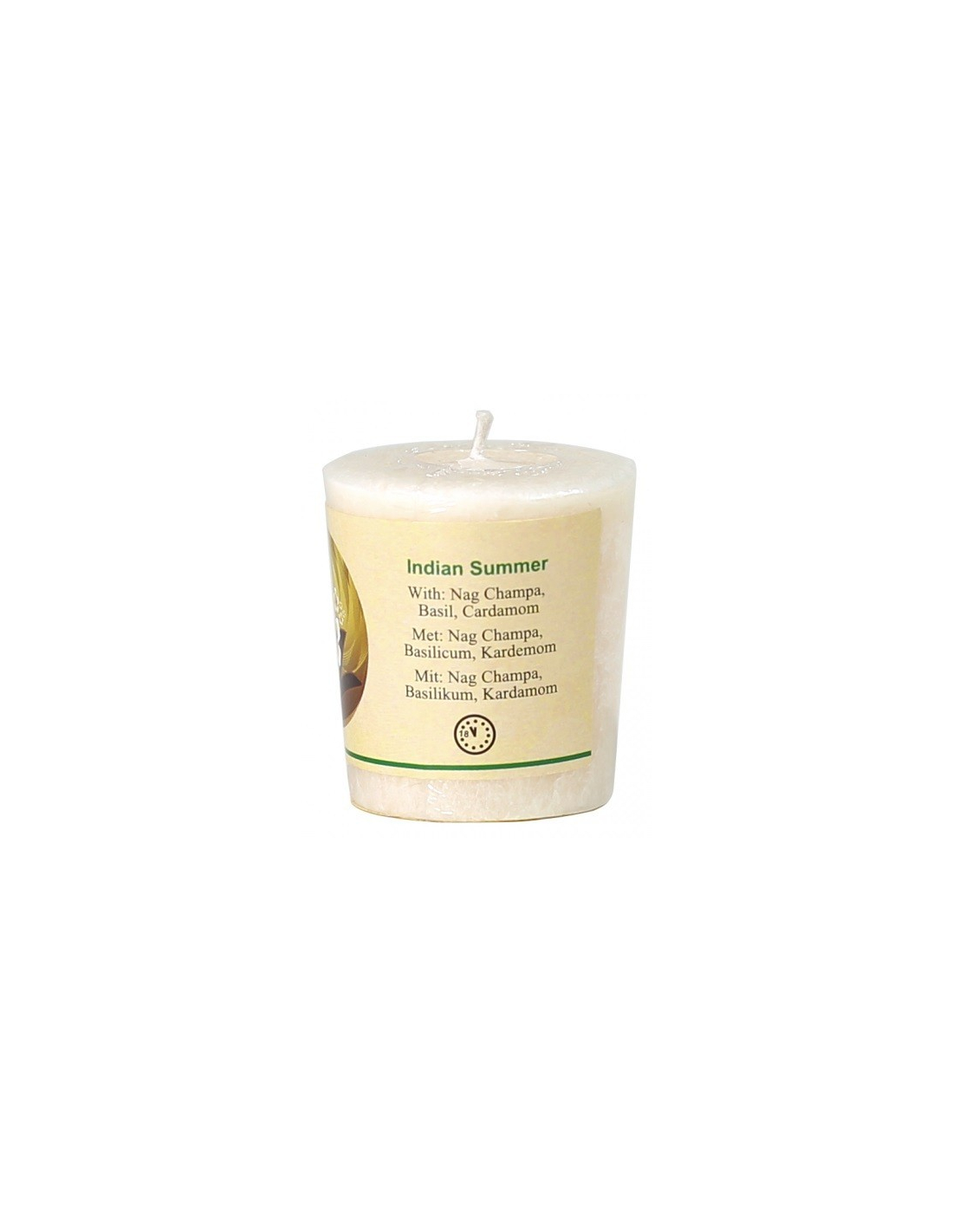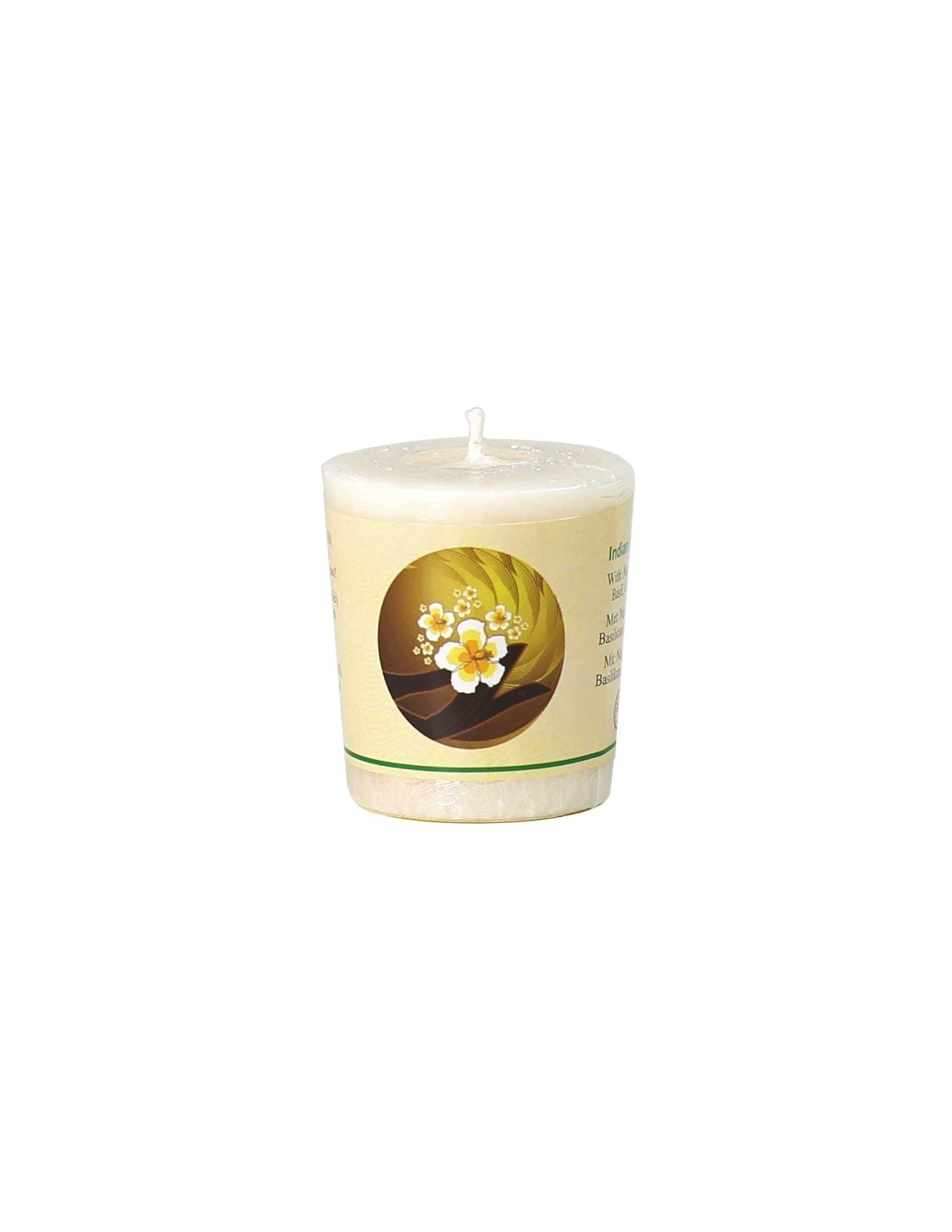 Stearine geurkaars met essentiële oliën: Nag Champa, Basilicum en Kardemom.