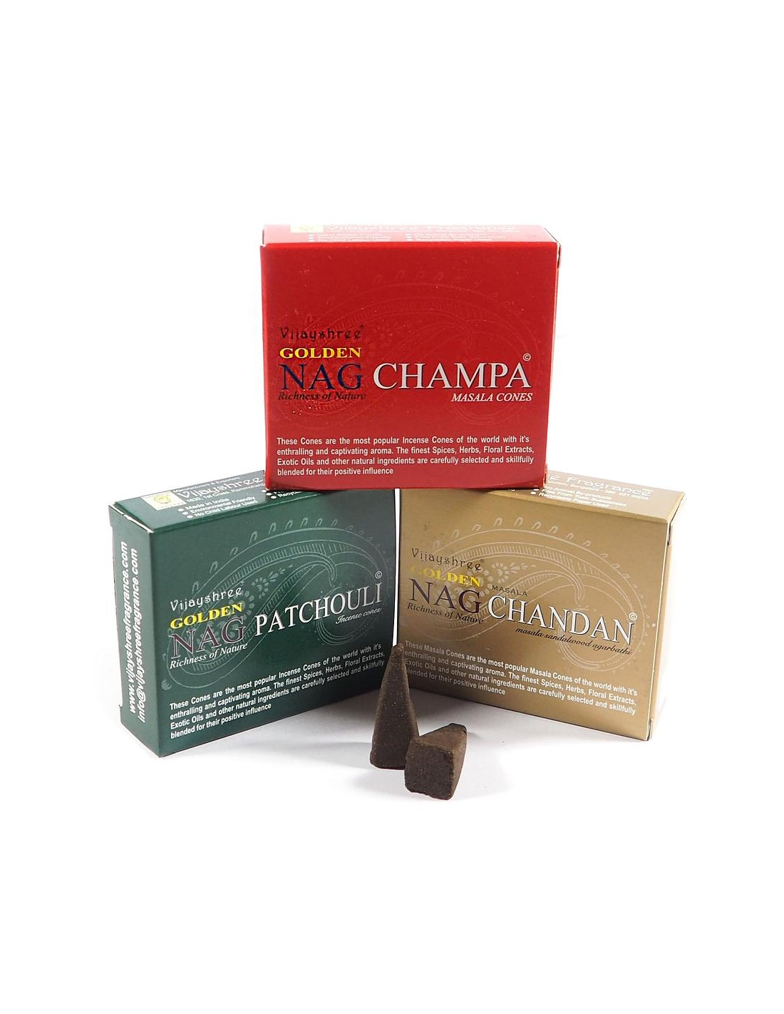 Golden Nag kegel wierook set van 3 (patchouli,nagchampa,chandan)