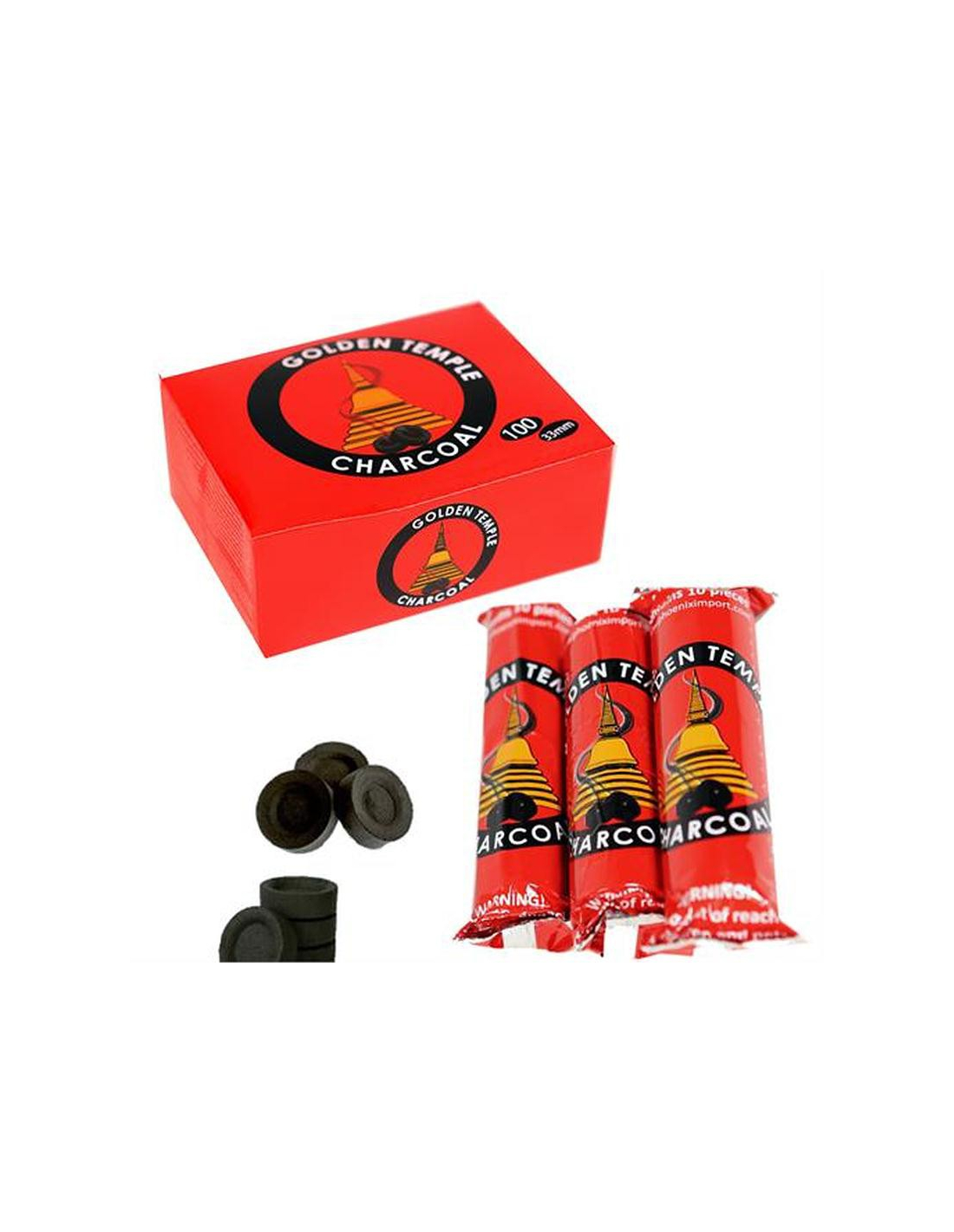 Doosje met Golden Temple houtskool tabletten voor het veilig branden van wierookhars, wierookkorrels en wierookpoeder.