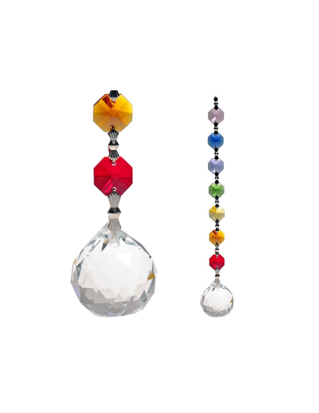 De ronde kristallen bol symboliseert de heelheid, het alles omvattende, eenheid. Kristallen raamdecoraties zijn bij uitstek geschikt om de feng-shui in woonkamer, slaapkamer en kantoor te verbeteren. De zeven kleine octagon kristallen symboliseren de 7 chakrakleuren. Wanneer je deze ophangt bij het raam dan tovert het zonlicht magische kleuren door de hele kamer!