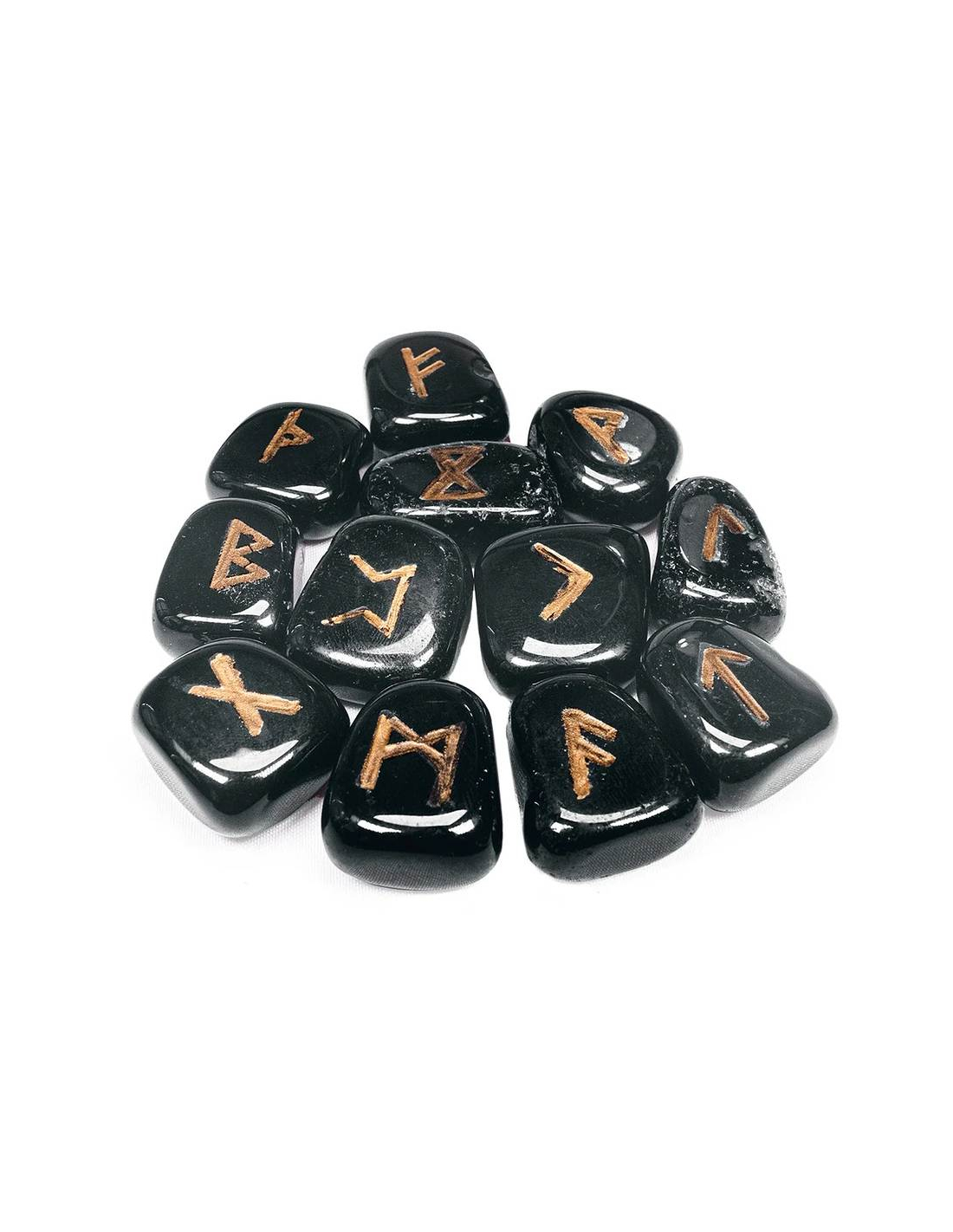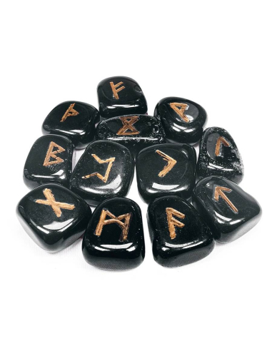 Runenstenen van Hematiet in buidel van velours met gegraveerde runensymbolen (25 stuks) en een instructieboekje. Een verfijnd artikel om aan anderen of aan zichzelf te geven.