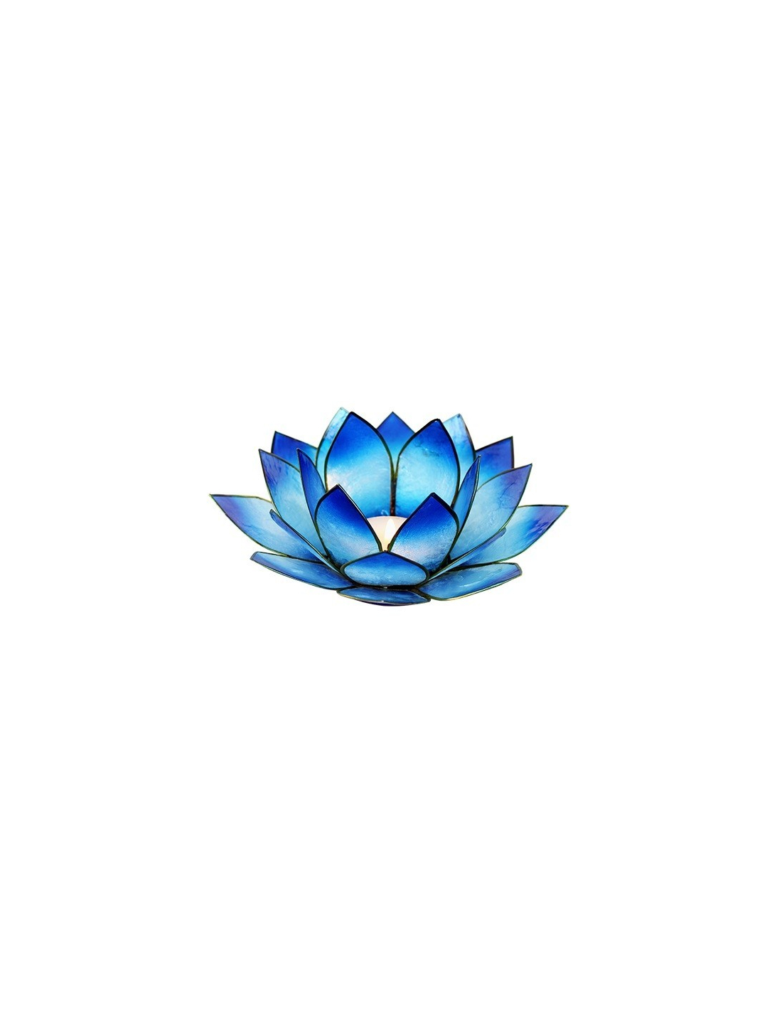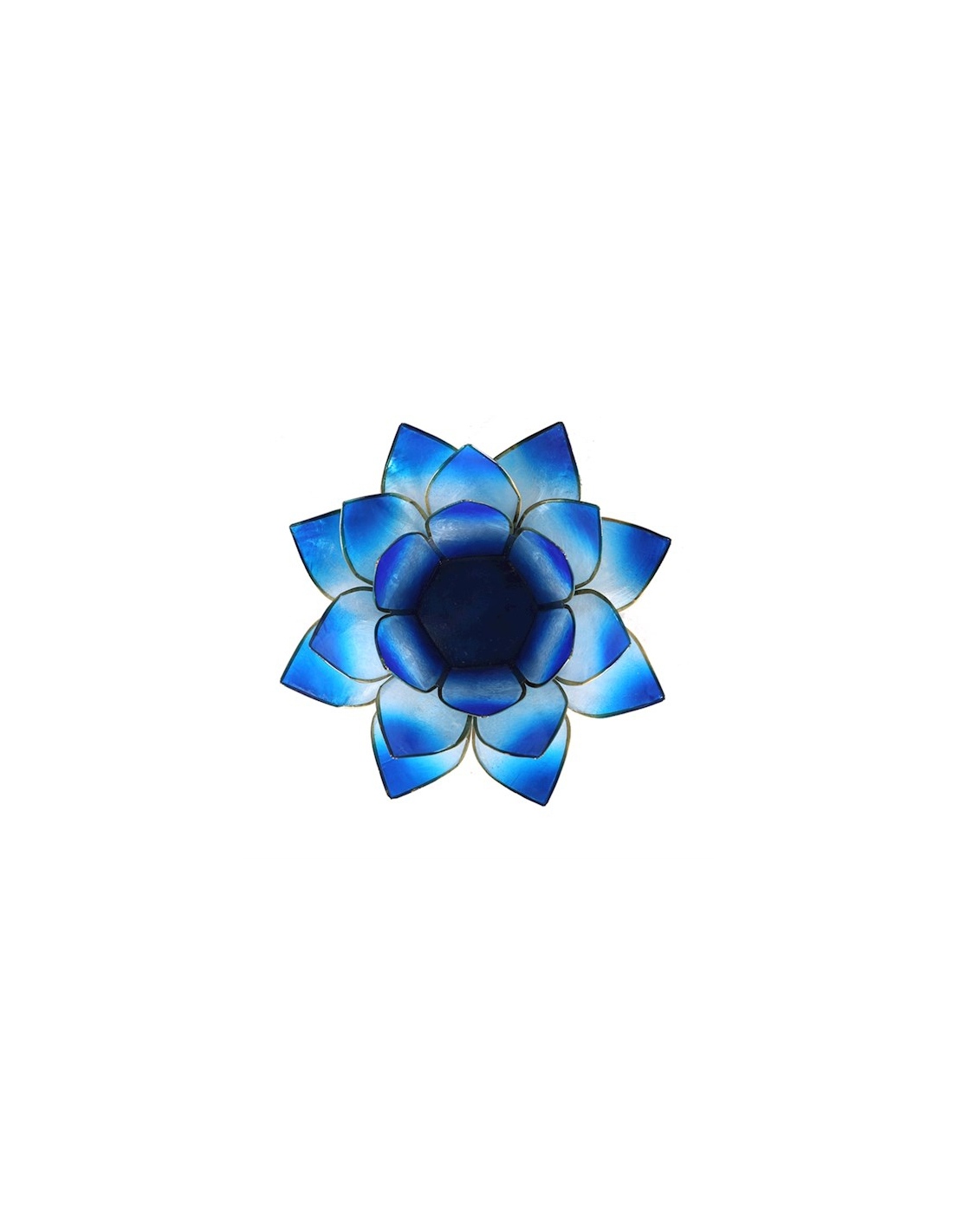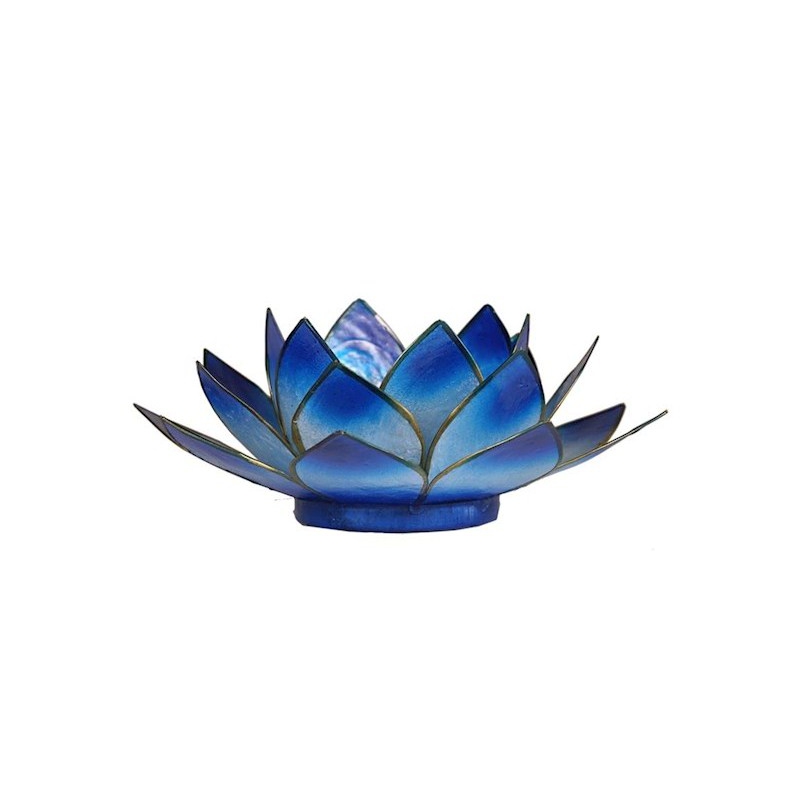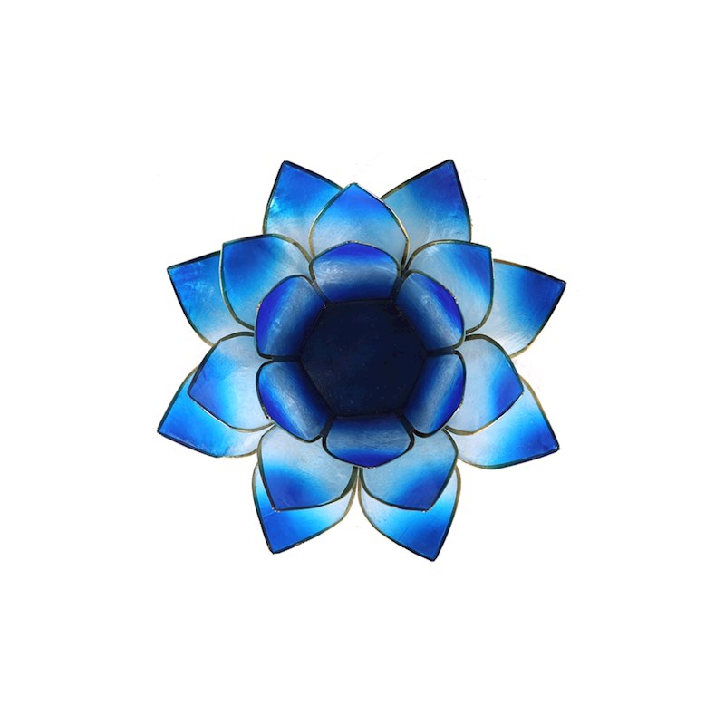Prachtige grote Lotus sfeerlicht gemaakt van Capiz schelp in de kleuren lichtblauw en donkerblauw. De Lotus is het symbool van duisternis naar licht, van onwetendheid naar weten. De lotus staat ook symbool voor de 7 energiecentra in het menselijk lichaam, de chakra's.