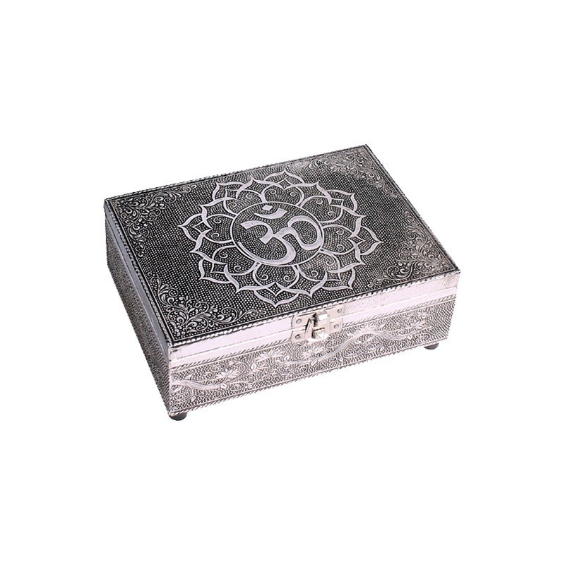 Tarotdoos Om Mani Padme Hum (zilverkleur)Prachtig tarotdoos met op de deksel een Om Mani Padme Hum symbool.